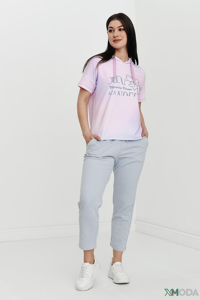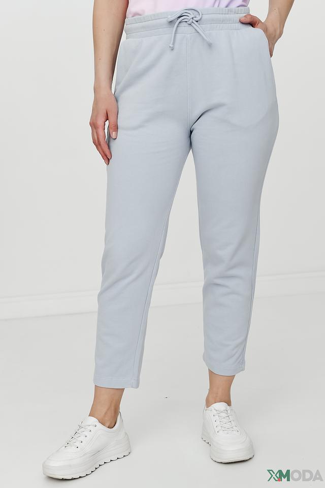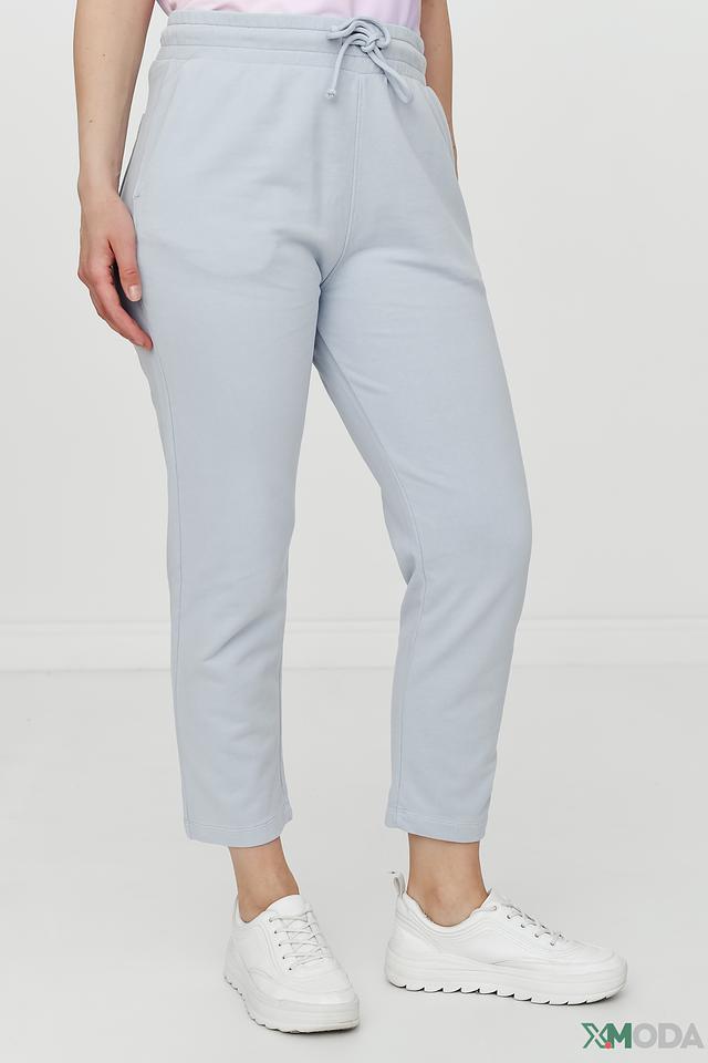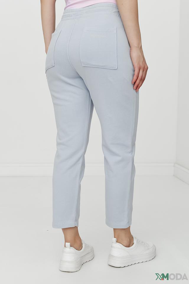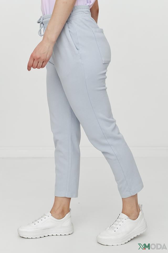 Брюки имеют прямой крой, пояс на эластичной резинке с регулирующим шнурком, а также два боковых кармана. Цвет брюк – нежный голубой, который легко сочетается с различными элементами одежды.