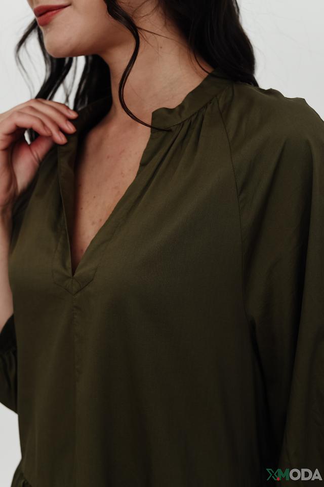 Платье имеет свободный крой, который не сковывает движений и позволяет создать расслабленный образ. V-образный вырез горловины и рукава 3/4 с манжетами добавляют изысканности. Многоярусная юбка придает платью лёгкость и воздушность.