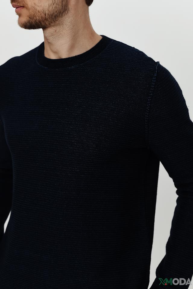 Джемпер имеет классический крой и круглый вырез горловины. Тёмно-синий цвет делает его универсальным и легко сочетаемым с различными элементами одежды. Фактурная вязка добавляет изделию объём и интересную текстуру.