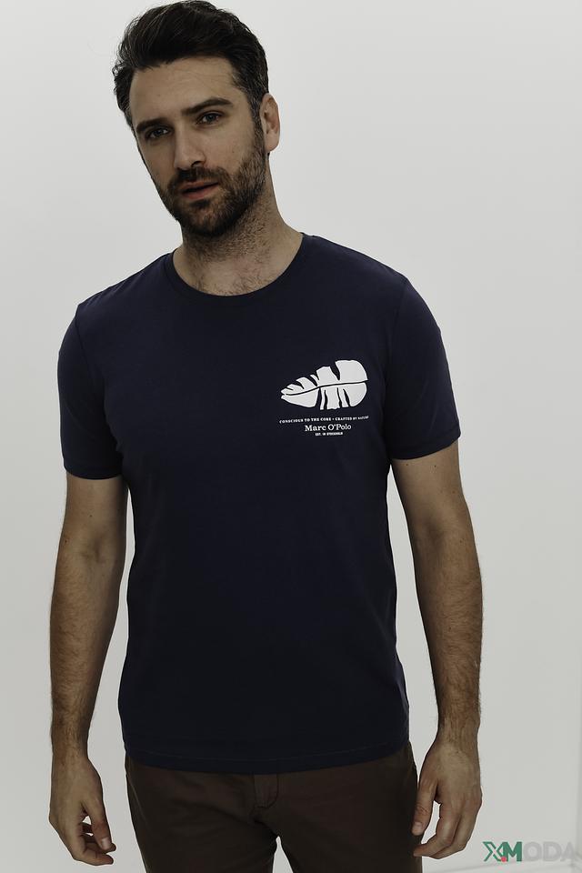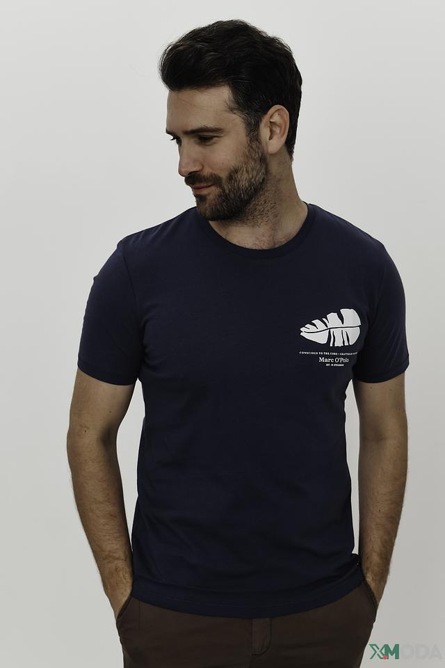 Мужская футболка Marc O Polo синего цвета, украшенная принтом с изображением листа. Изготовлена из 100% хлопка, обеспечивающего комфорт и воздухопроницаемость. Стильный и лаконичный дизайн. Состав: хлопок 100%