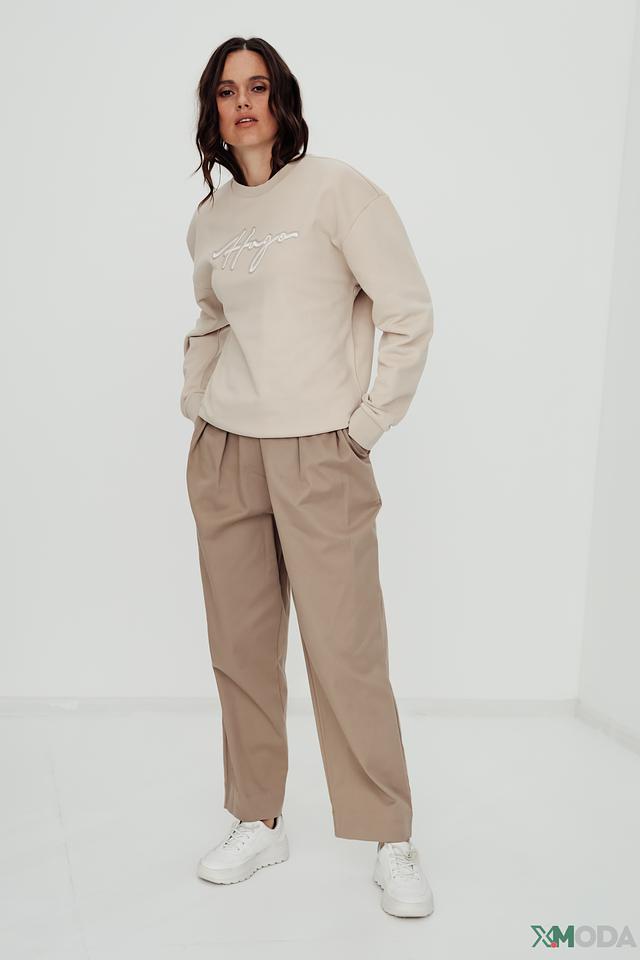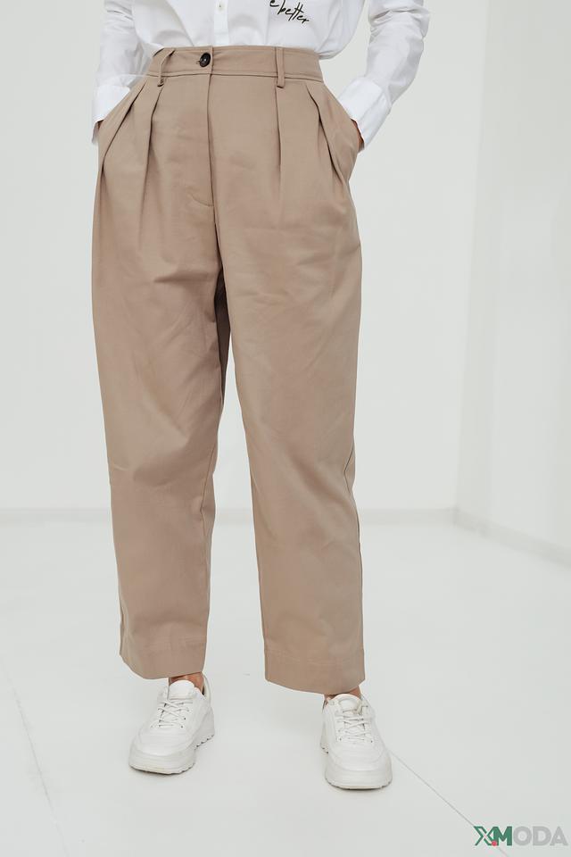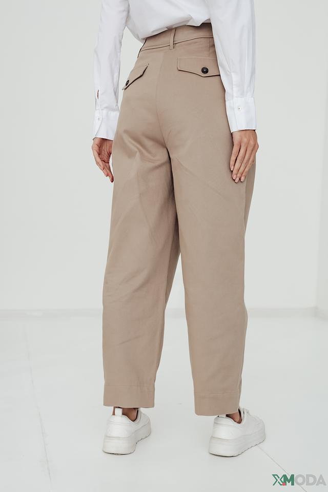 Брюки имеют прямой крой и пояс с аккуратными защипами, что придает им более изысканный вид. Застежка на пуговицу и молнию обеспечивает надежную фиксацию. Модель дополнена боковыми карманами.