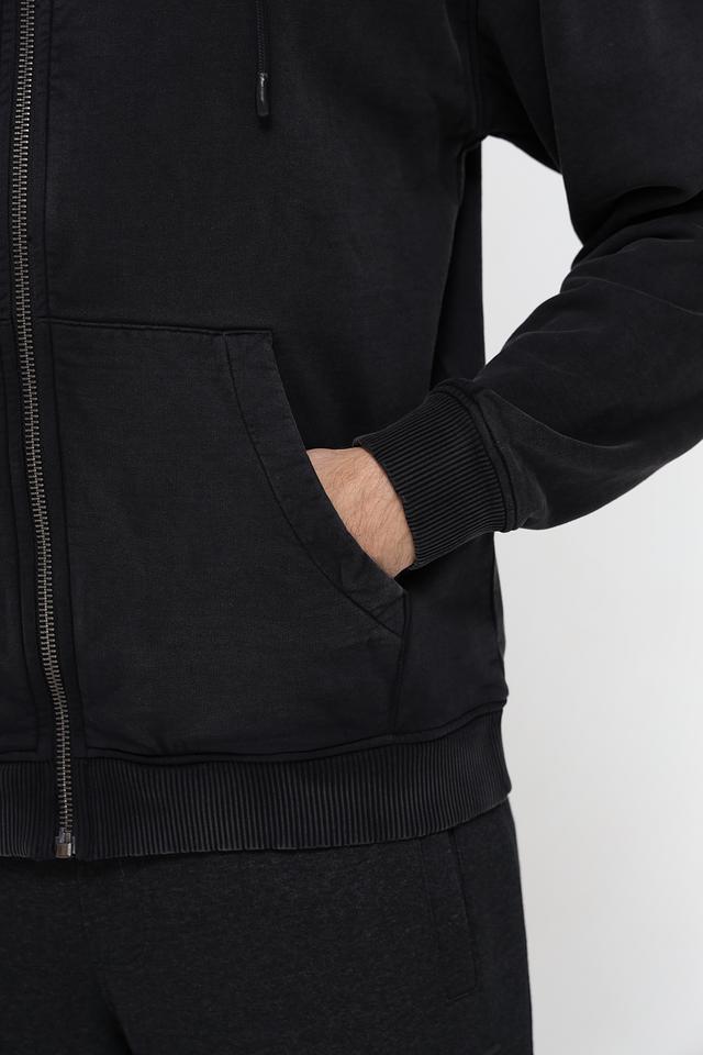 Кардиган имеет удобный капюшон и застёжку на молнии, что позволяет регулировать степень защиты от ветра и холода. На груди и спине размещены принты и надписи, добавляющие изделию индивидуальности и стиля.