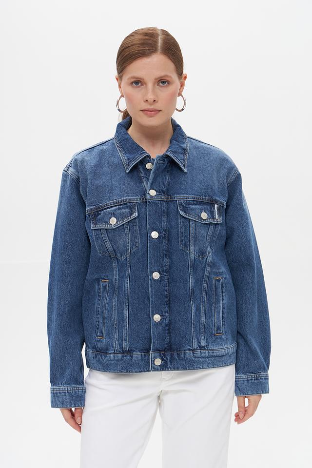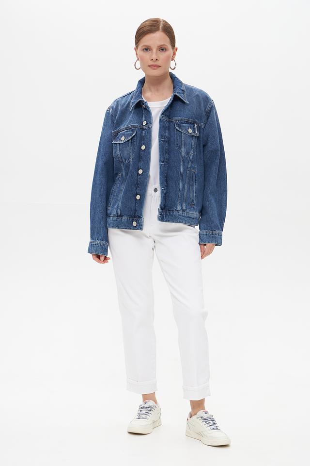 Куртка имеет классический джинсовый дизайн с застежкой на пуговицы и двумя накладными карманами на груди. Прямой крой обеспечивает свободу движений и подходит для различных типов фигур.