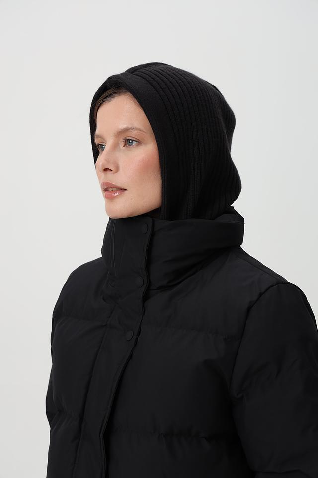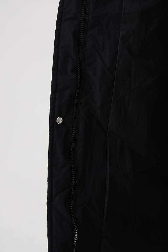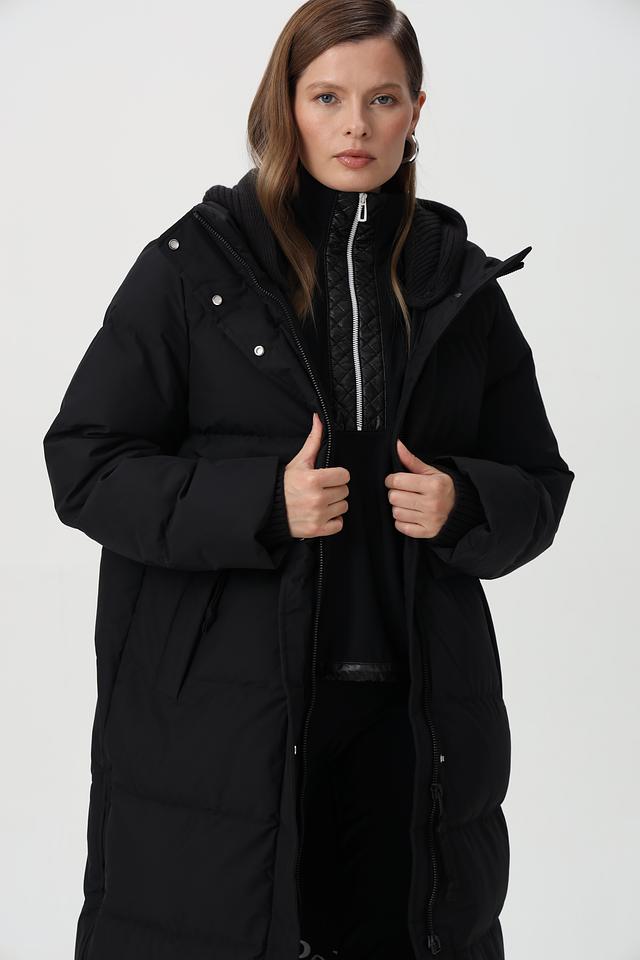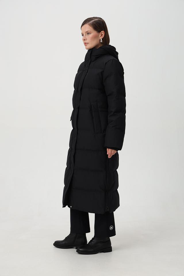 Пальто имеет длину макси и прямой крой, который подчеркивает силуэт и обеспечивает комфорт в движении. Капюшон защитит от ветра и непогоды, а застежка-молния позволяет регулировать степень теплоизоляции.