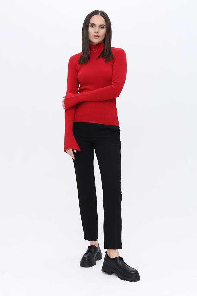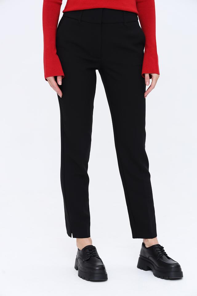Брюки имеют прямой крой, который визуально вытягивает силуэт и обеспечивает свободу движений. Высокая посадка подчеркивает талию и создает женственный образ. Застежка на молнию и пуговицу обеспечивает надежную фиксацию.