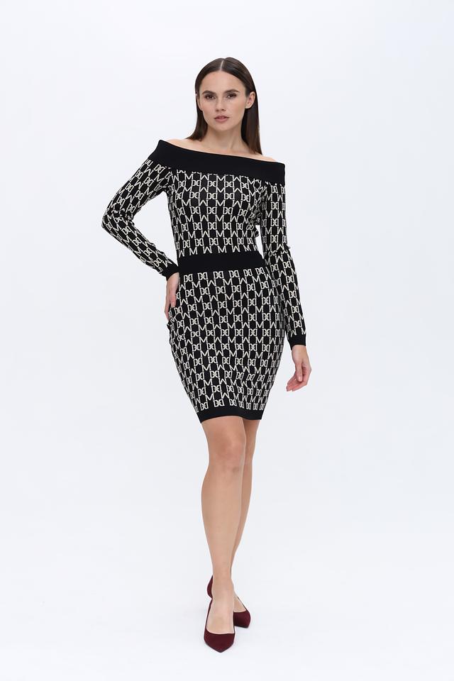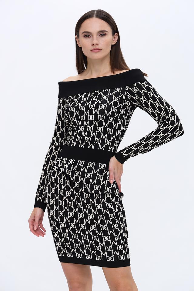 Вся поверхность платья покрыта повторяющимся логотипом бренда, создавая эффектный и запоминающийся образ. Платье имеет приталенный силуэт, который подчеркивает достоинства фигуры.