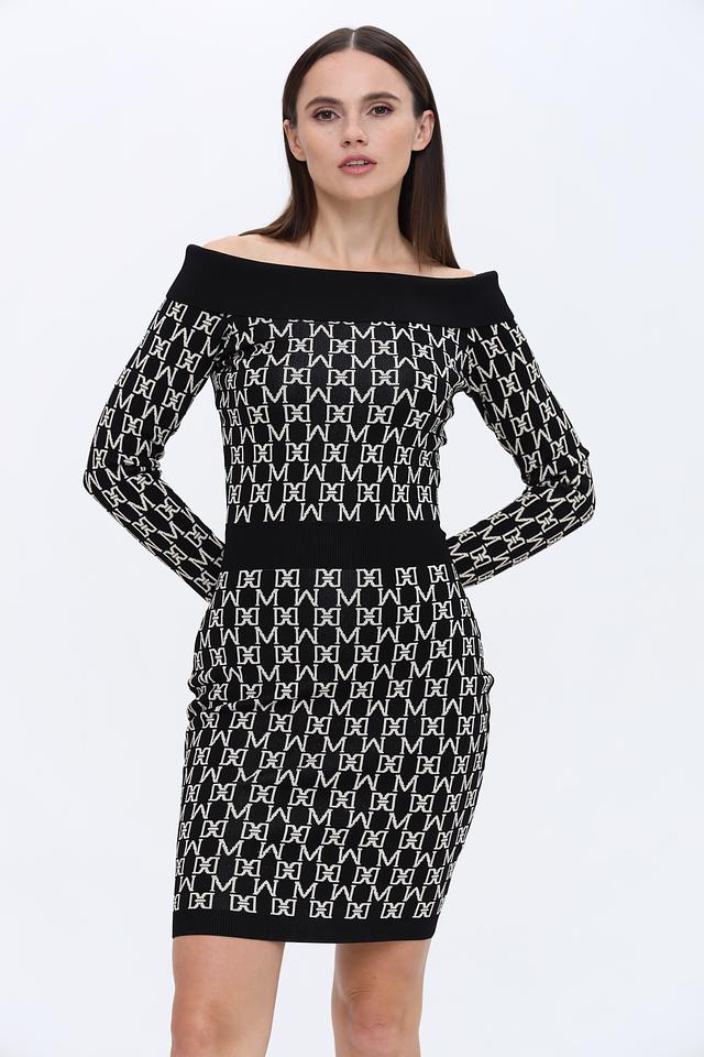Платье Marciano черного цвета с длинным рукавом и открытыми плечами, украшенное фирменным логотипом по всей поверхности. Трикотажное платье облегающего силуэта идеально подчеркнет фигуру и станет стильным дополнением вашего гардероба. Состав: вискоза 72%, полиамид 15%, полиэстер 7%, металл 4%, эластан 2%