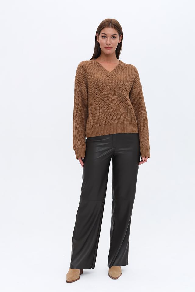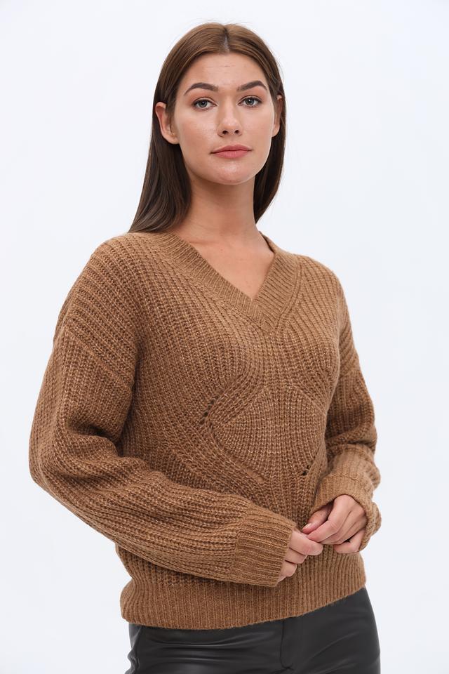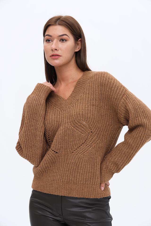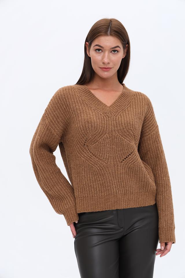 Коричневый джемпер Marciano с V-образным вырезом и объёмным узором. Изготовлен из мягкой пряжи с добавлением шерсти, что обеспечивает комфорт и тепло. Стильный и универсальный выбор для создания повседневных образов. Состав: полиакрил 50%, полиамид 30%, шерсть 20%