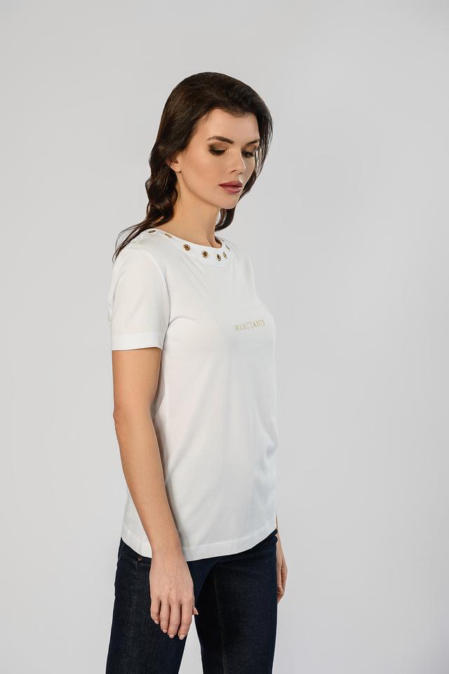 Белая футболка Marciano с коротким рукавом, украшенная декоративными металлическими кольцами по горловине. Изготовлена из мягкого и приятного к телу сочетания хлопка и модала, обеспечивая комфорт в носке. Состав: хлопок 50%, модал 50%
