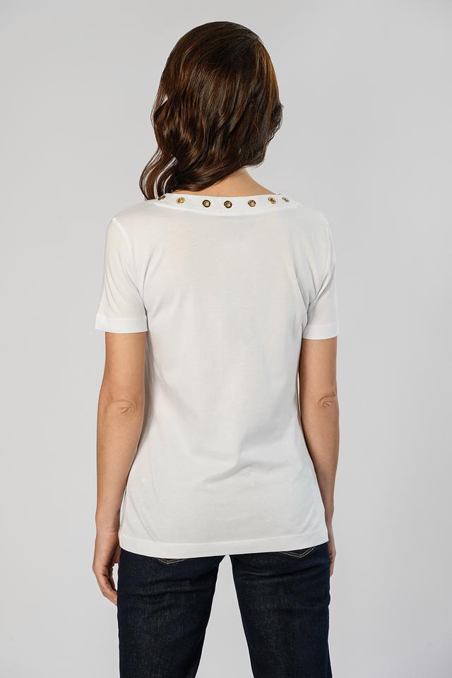 Особенностью данной модели является декоративная отделка горловины в виде металлических колец золотистого оттенка, которые придают футболке изысканность и оригинальность. Краткий рукав и прямой крой обеспечивают комфортную посадку по фигуре.
