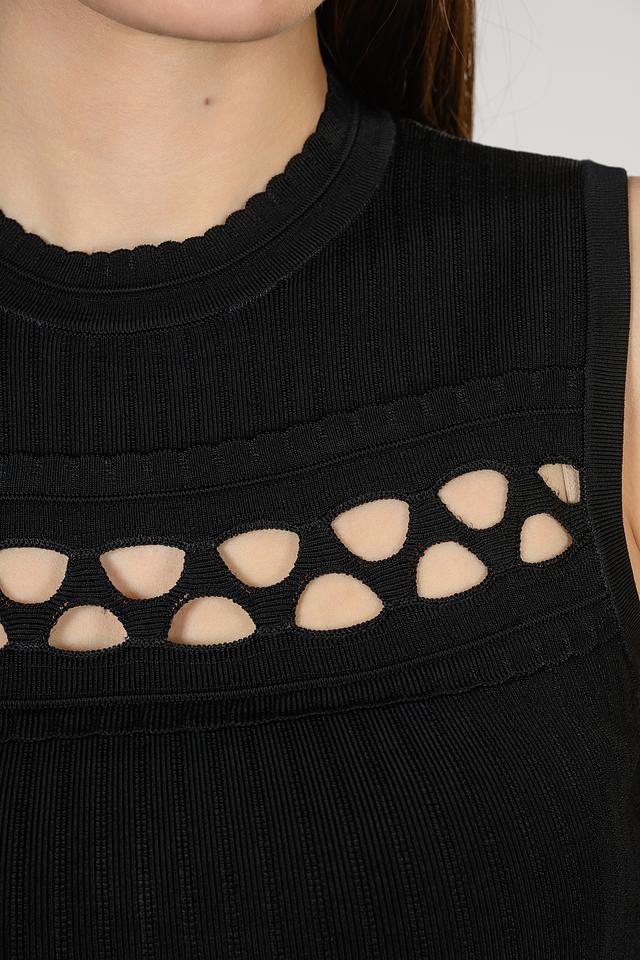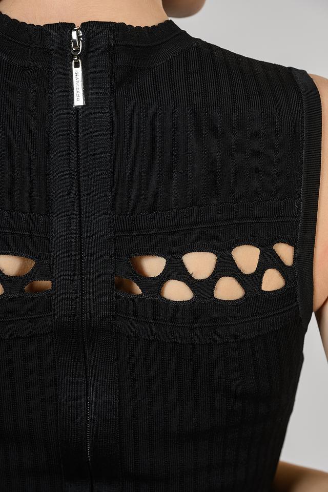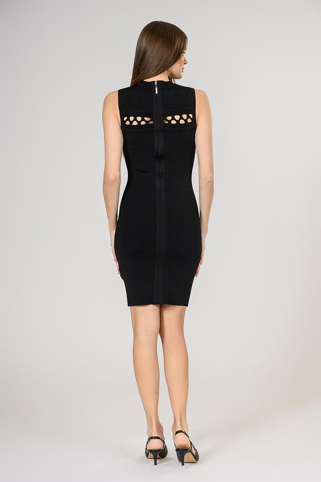 Платье имеет длину до колена и классический чёрный цвет. Особый акцент сделан на вырезы на лифе, которые придают образу пикантность и оригинальность. Высокий круглый вырез горловины дополнен декоративной обработкой.
