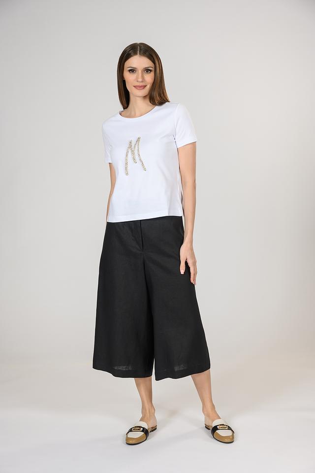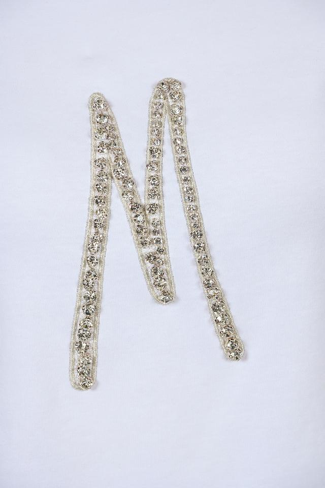 Модель имеет прямой крой и короткие рукава, что делает ее универсальной для различных образов. Главная особенность этой футболки – стильный логотип в виде букв, выполненный с использованием декоративных элементов.