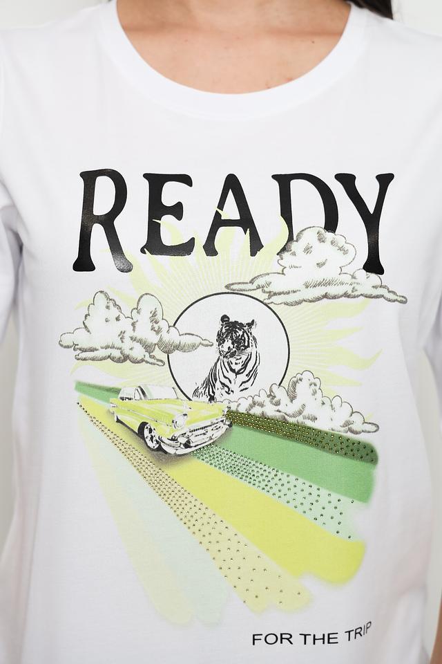 Эта стильная футболка от Margittes выполнена в белом цвете и украшена оригинальным принтом с изображением тигра и надписью "READY FOR THE TRIP". Футболка имеет прямой крой и короткие рукава, что делает ее идеальным выбором для повседневной носки.