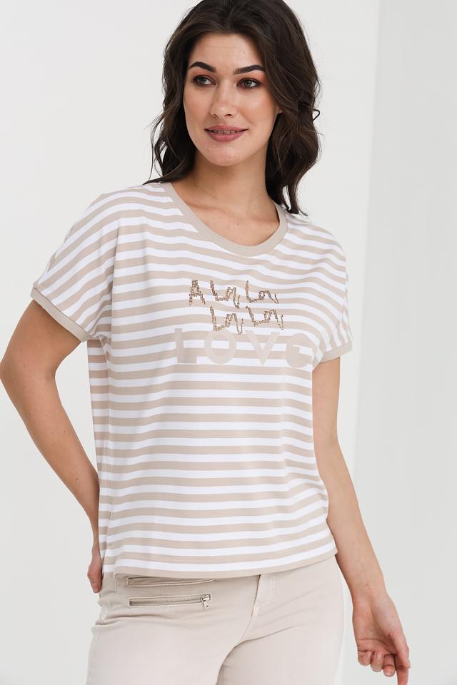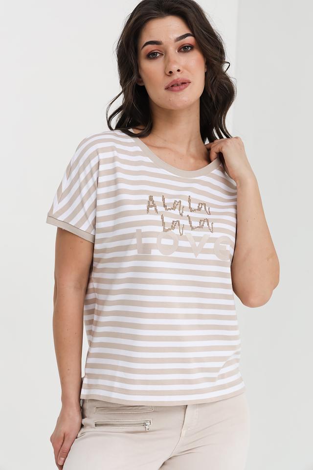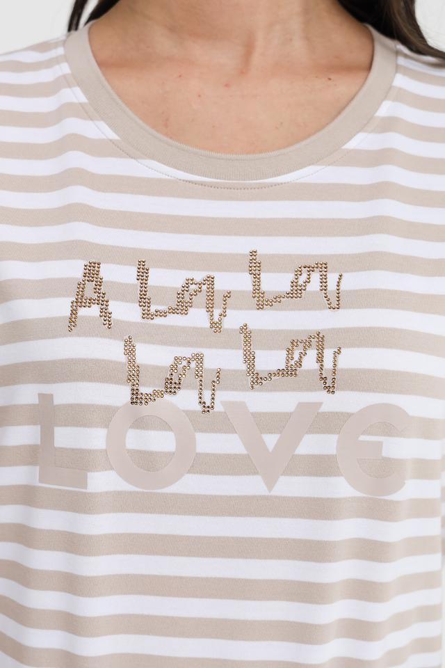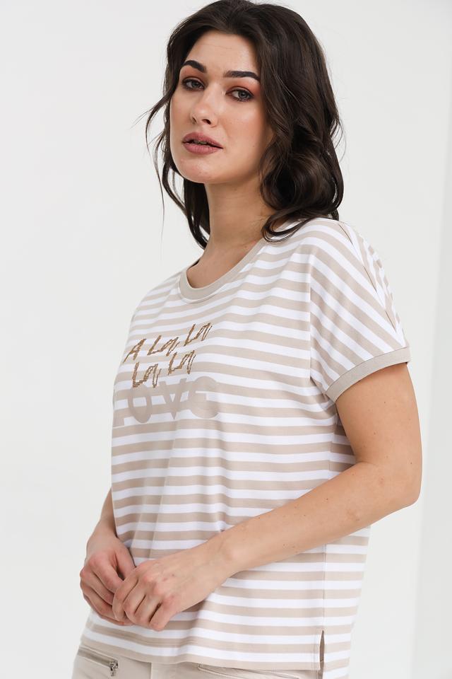 Женская футболка Margittes бежевого цвета с полоской и надписью "A La La Love" станет отличным дополнением к вашему гардеробу. Модель выполнена из мягкого хлопка, обеспечивающего комфорт в течение дня. Состав: хлопок 100%