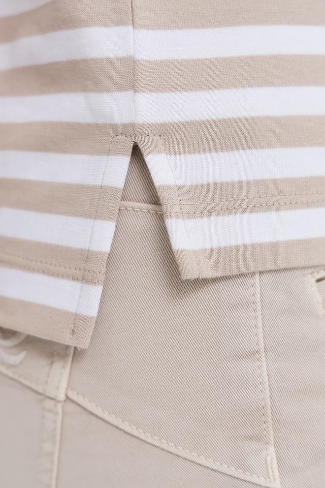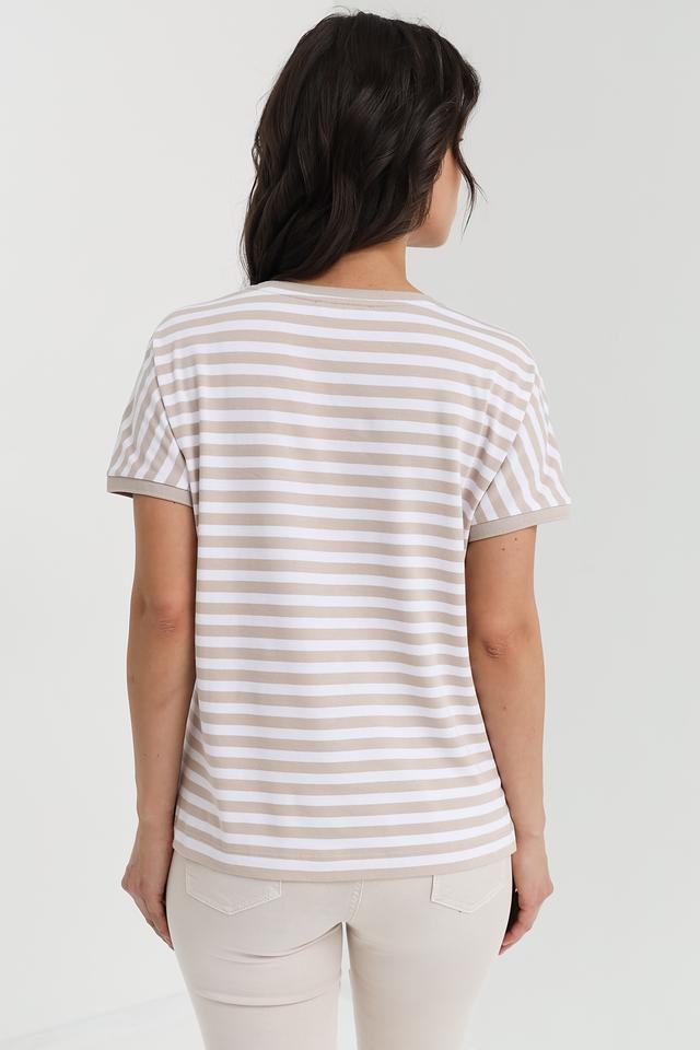 Эта стильная футболка от Margittes выполнена в бежево-белой полоску, что придает ей свежий и современный вид. Футболка имеет прямой крой и короткий рукав с манжетой, что делает ее удобной для повседневной носки.