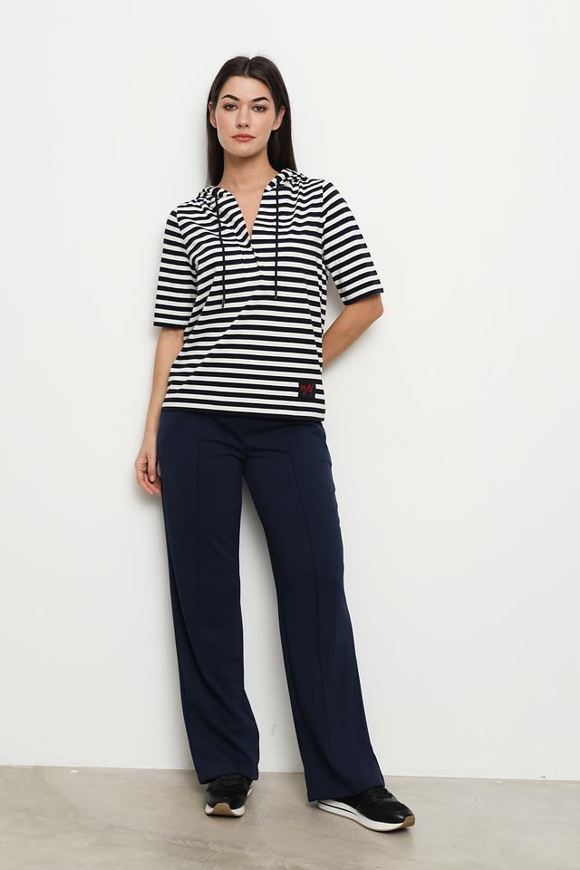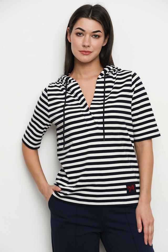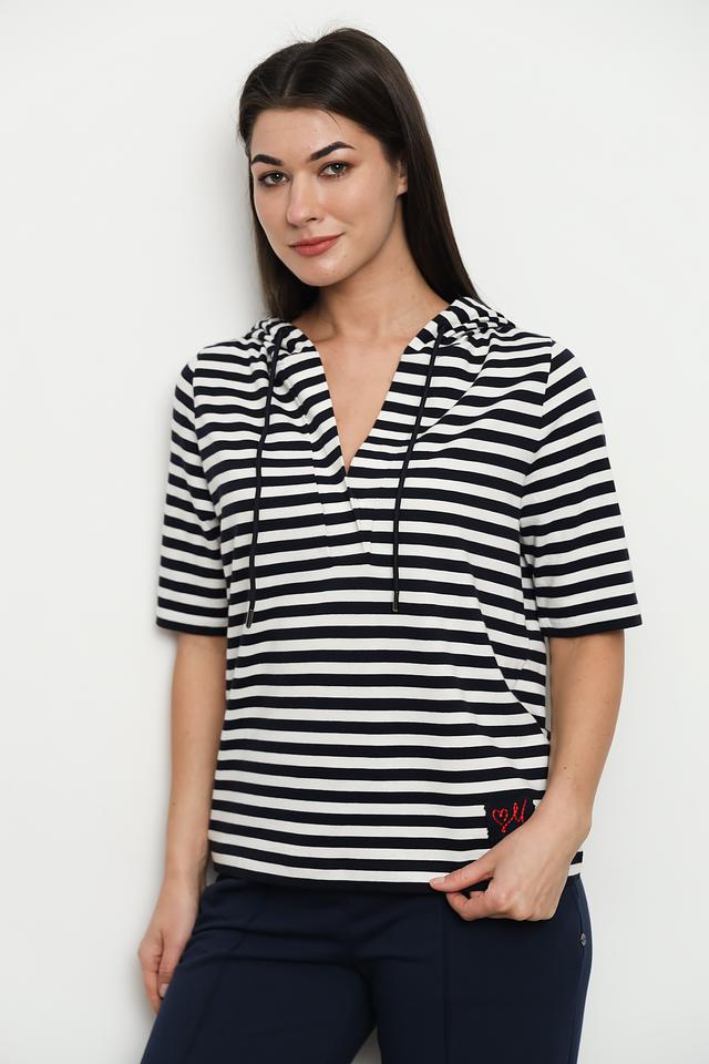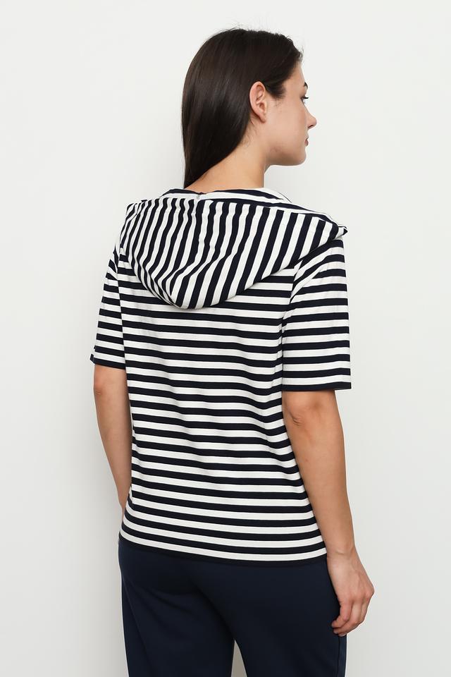 Женская футболка Margittes выполнена в классической бело-синей полоску и дополнена удобным капюшоном. Модель с коротким рукавом и V-образным вырезом станет отличным дополнением к вашему образу. Состав: хлопок 100%