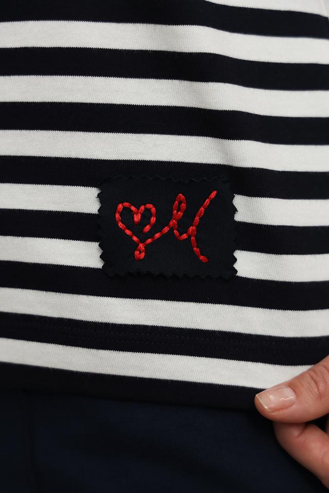 На груди расположена небольшая вышивка в виде сердца, выполненная красными нитками, которая добавляет оригинальности и индивидуальности изделию. Эта футболка идеально подойдет для создания повседневных образов в стиле casual.
