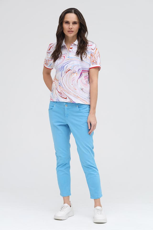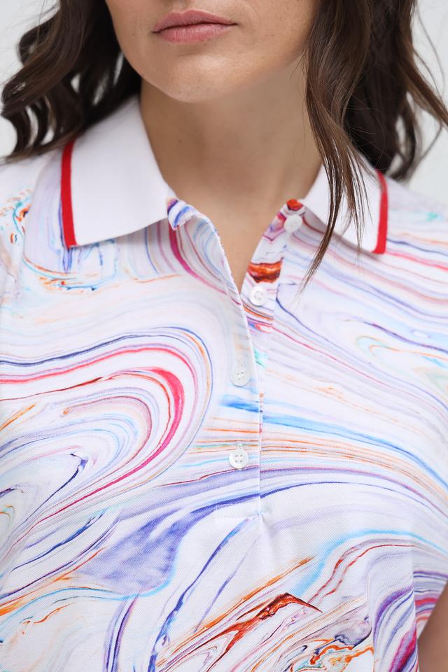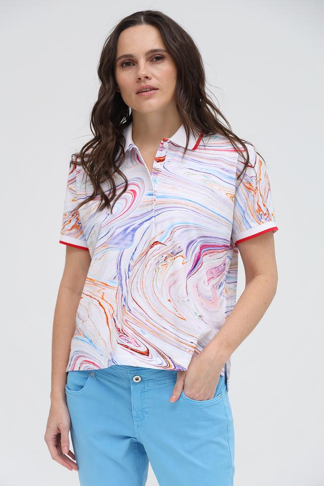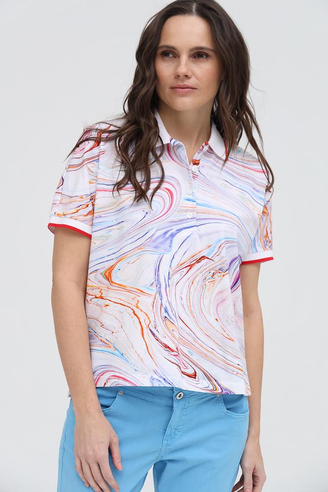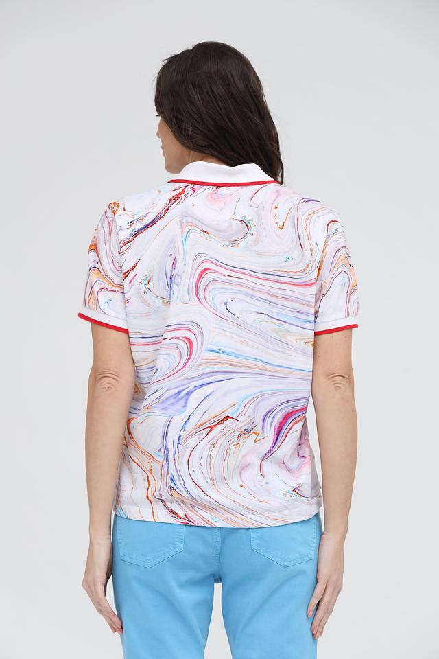 Это женское поло от бренда Margittes, выполненное в оригинальном дизайне с абстрактным "мраморным" принтом. Модель имеет классический крой с короткими рукавами и воротником-поло.