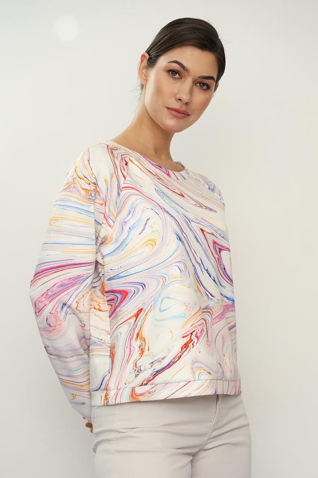 Женский пуловер Margittes в нежном "мраморном" расцвете станет стильным дополнением к вашему гардеробу. Модель выполнена из мягкого и приятного к телу материала, обеспечивающего комфорт в течение дня. Состав: полиэстер 94%, эластан 6%