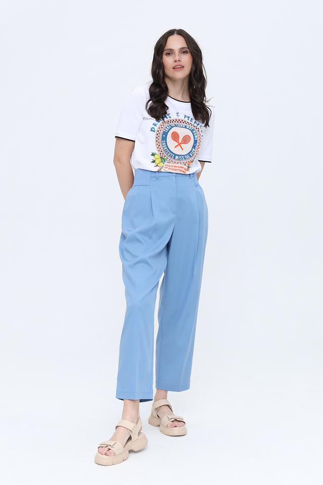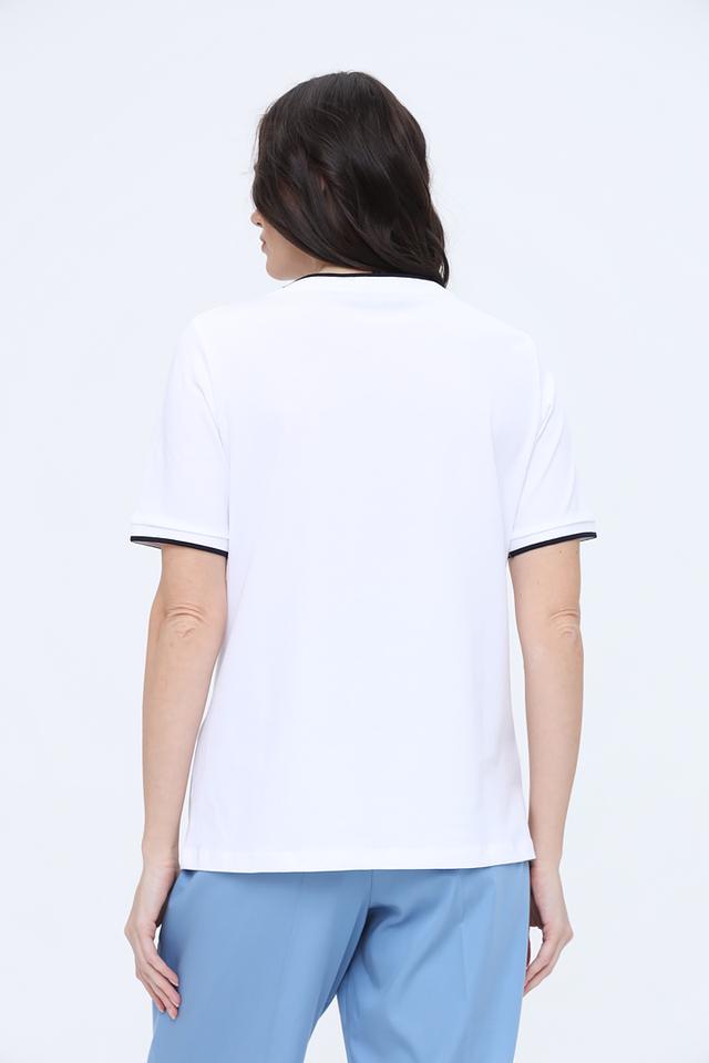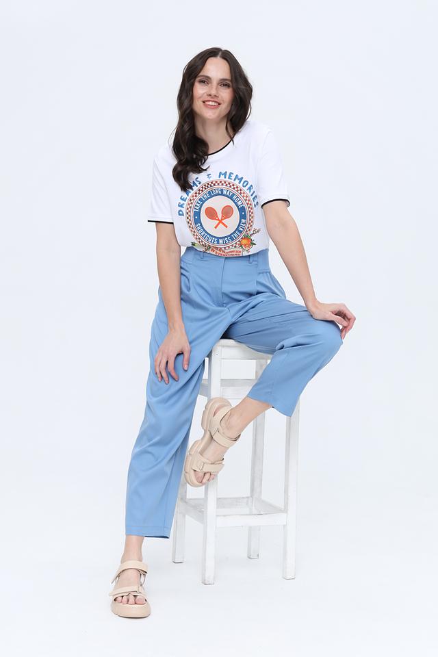 Футболка имеет прямой крой, короткие рукава с черной полосой по краю и круглый вырез горловины. Она идеально сочетается с джинсами, шортами или юбками, позволяя создавать разнообразные образы на каждый день. Эта футболка станет ярким акцентом в вашем гардеробе и подчеркнет вашу индивидуальность.