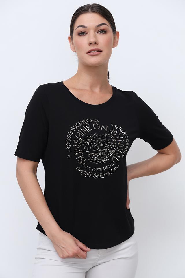 Основной цвет футболки – чёрный, который легко сочетается с другими элементами одежды. Главная особенность модели – эффектный декор, выполненный в виде надписи и рисунка, инкрустированных мерцающими элементами. Этот декор придает футболке изысканность и оригинальность.