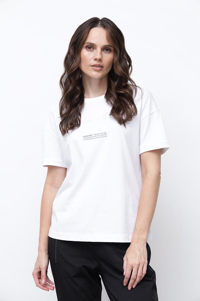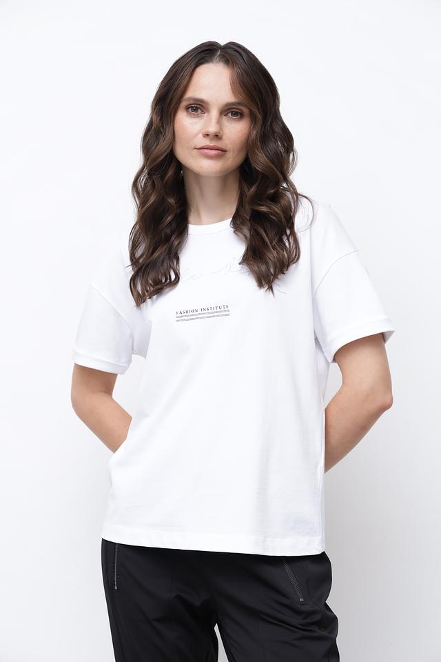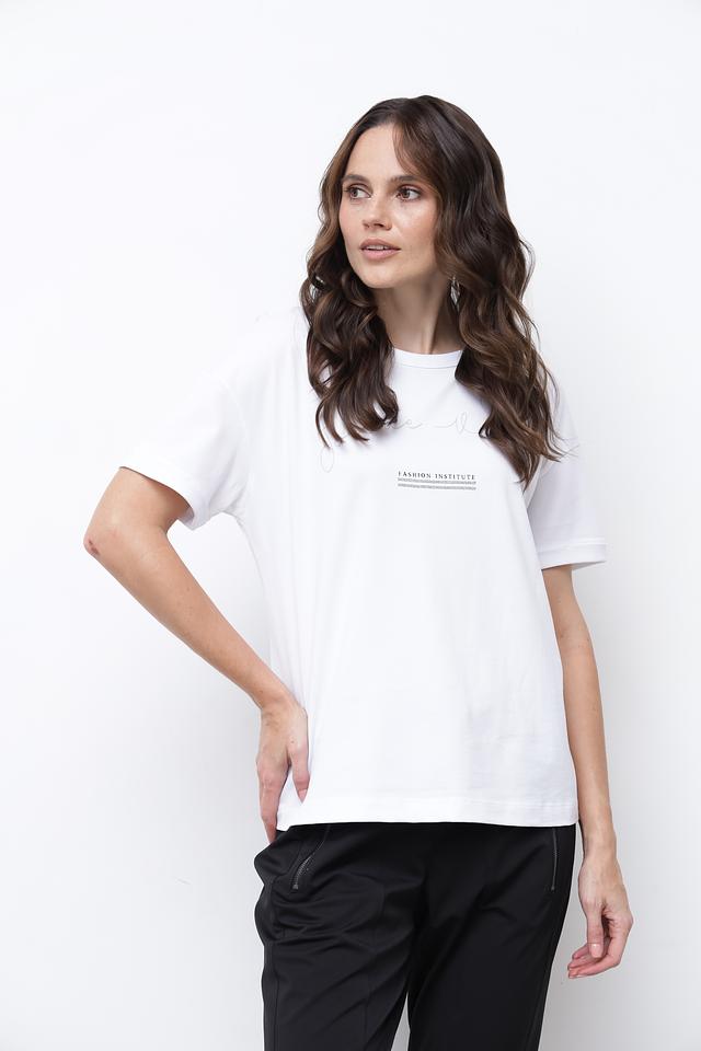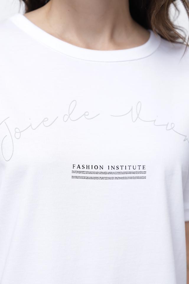 Футболка имеет прямой крой, короткие рукава и круглый вырез горловины. На передней части изделия расположен небольшой принт с надписью “FASHION INSTITUTE”, который добавляет образу изысканности.