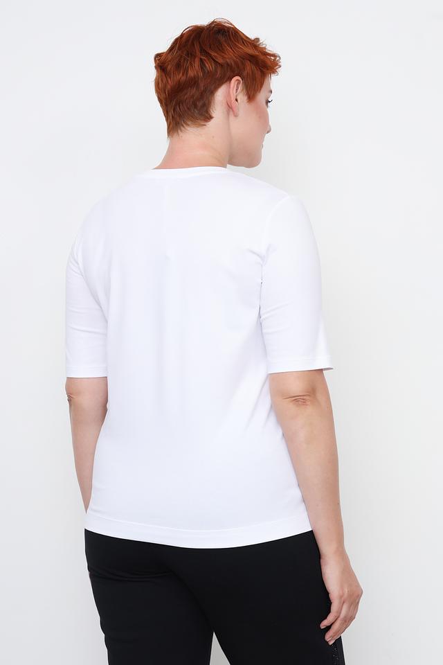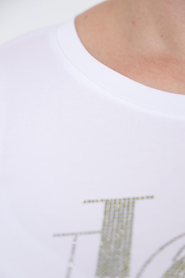 Белая футболка от Margittes с оригинальным декором "JOY" из страз. Модель выполнена из мягкого хлопка с добавлением эластана для комфортной посадки и свободы движений. Идеальный выбор для создания стильного повседневного образа. Состав: хлопок 96%, эластан 4%