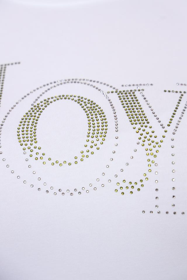 Особенностью данной модели является стильный декор "JOY", выполненный из мерцающих страз. Этот акцент придает футболке изысканность и индивидуальность.