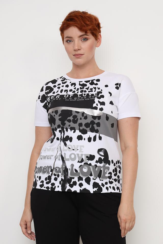 Основной цвет футболки – белый, а главным элементом дизайна является эффектный леопардовый принт, выполненный в чёрно-серых тонах. Дополнительно футболка украшена надписью "Power of Love", которая добавляет ей индивидуальности.