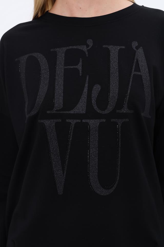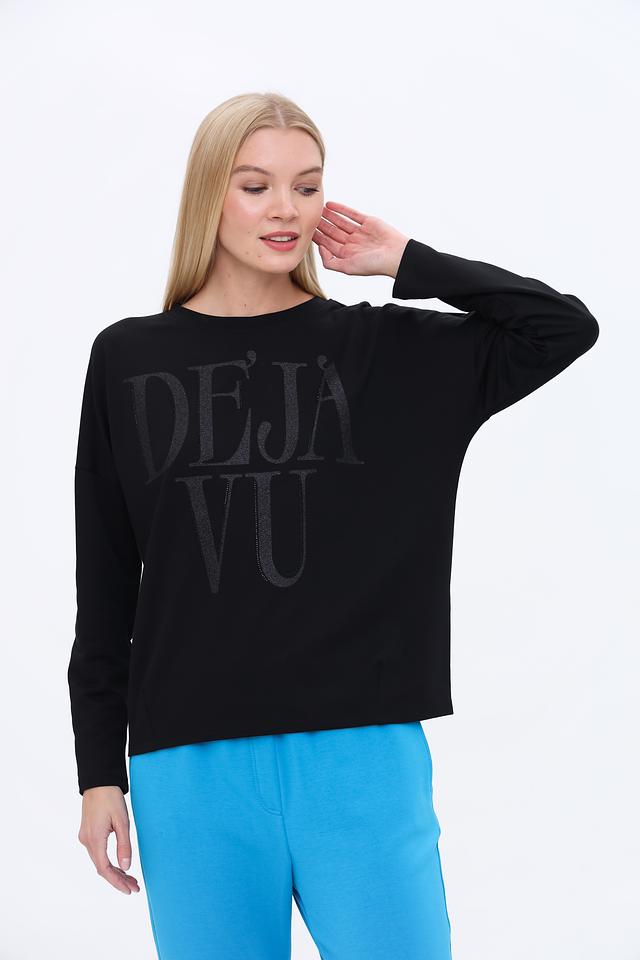 Пуловер имеет свободный крой, круглый вырез горловины и длинные рукава. Передняя часть украшена крупной надписью "DEJA VU", выполненной в тон изделия, что придает ему особый шарм и индивидуальность.