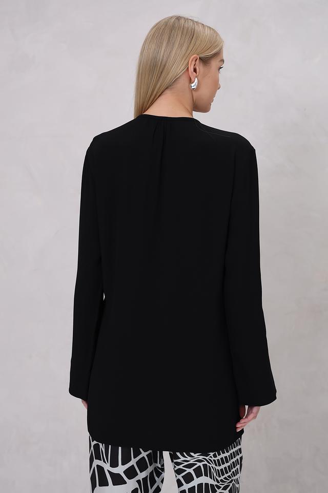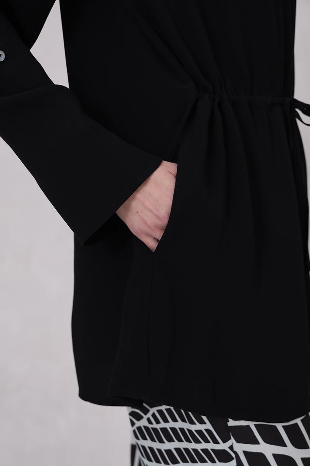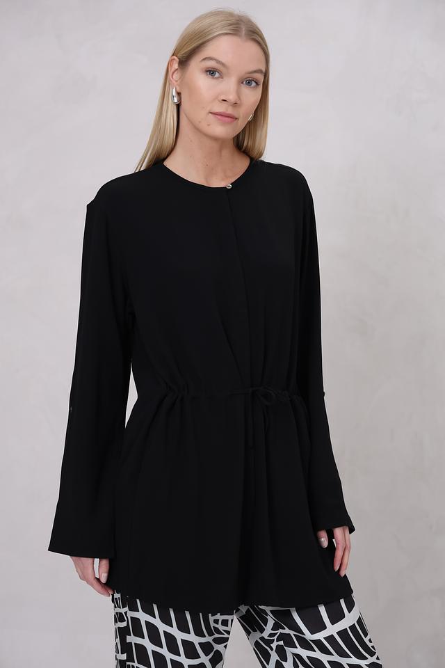 Чёрная блуза от Margittes выполнена из мягкого лиоцела и имеет удобную завязку на талии. Свободный крой и длинные рукава делают эту модель идеальной для создания комфортных и стильных образов. Состав: лиоцел 100%