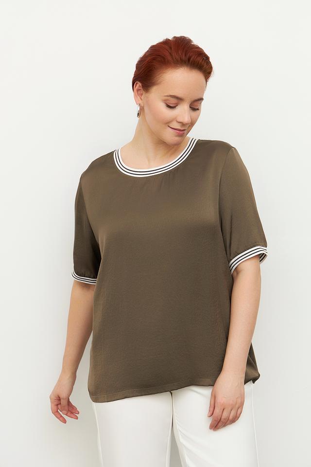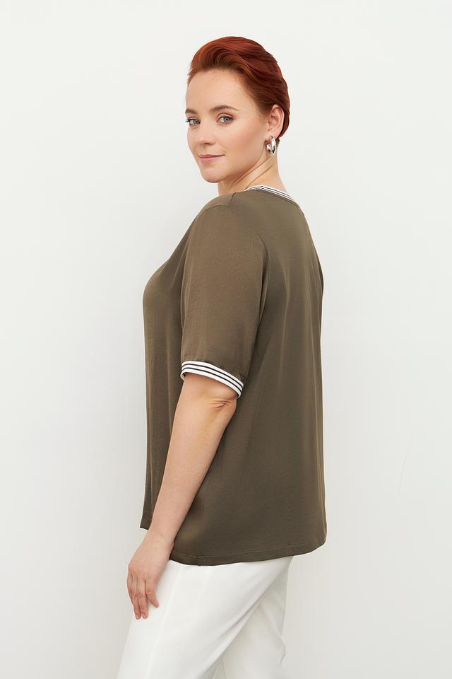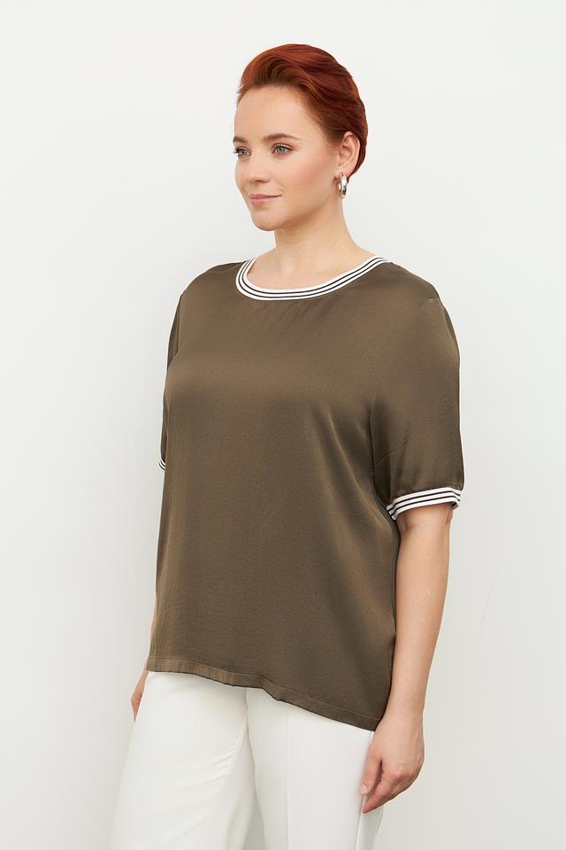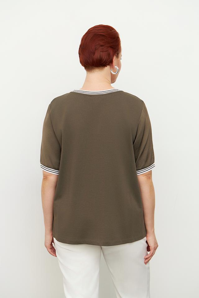 Блуза от Margittes цвета хаки с короткими рукавами и контрастной полоской на горловине и рукавах. Изготовлена из мягкого и приятного к телу сочетания хлопка и вискозы, обеспечивающего комфорт в носке. Состав: хлопок 52%, вискоза 48%