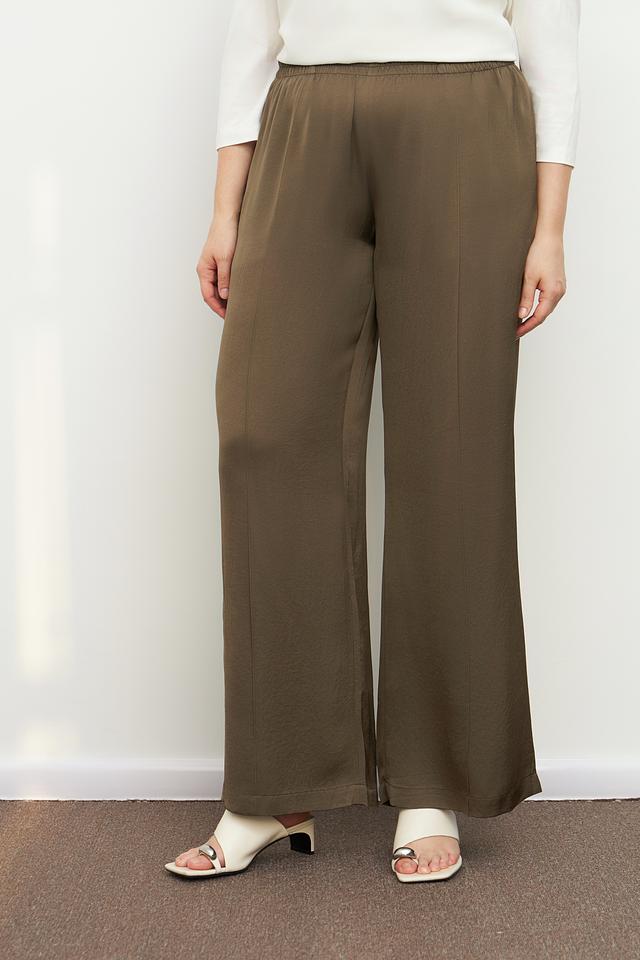 Брюки имеют клёшеный силуэт, который визуально удлиняет ноги и придает образу женственность. Эластичный пояс обеспечивает удобную посадку по фигуре, не стесняя движений.
