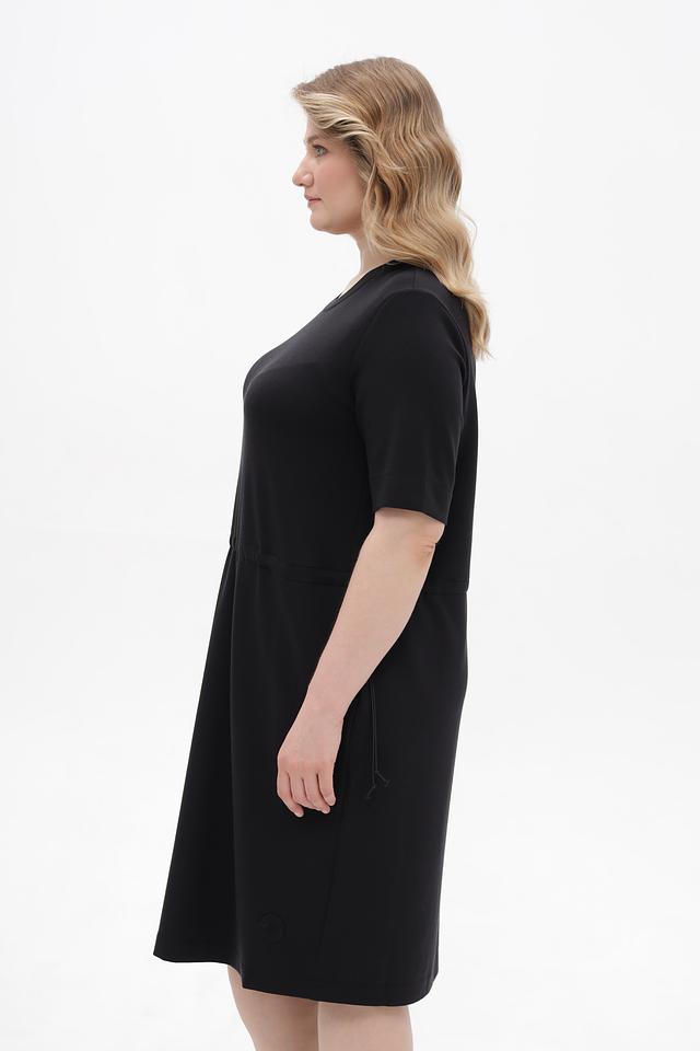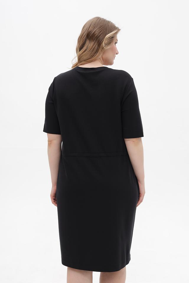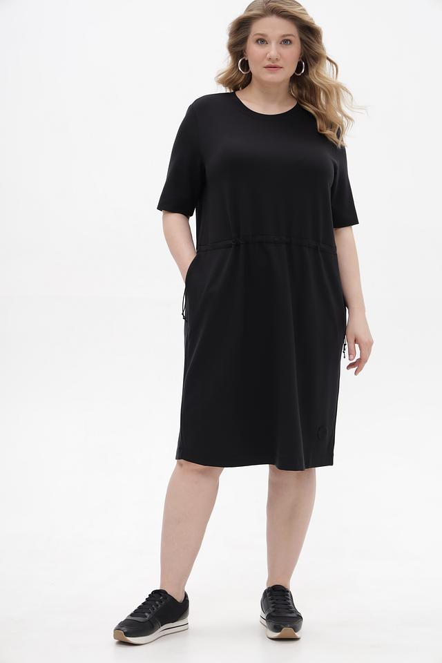 Чёрное платье от Margittes свободного кроя, выполнено из мягкой ткани с добавлением лиоцелла. Модель дополнена удобными боковыми карманами и сборкой по талии с завязками. Состав: лиоцел 78%, эластан 12%, полиамид 10%