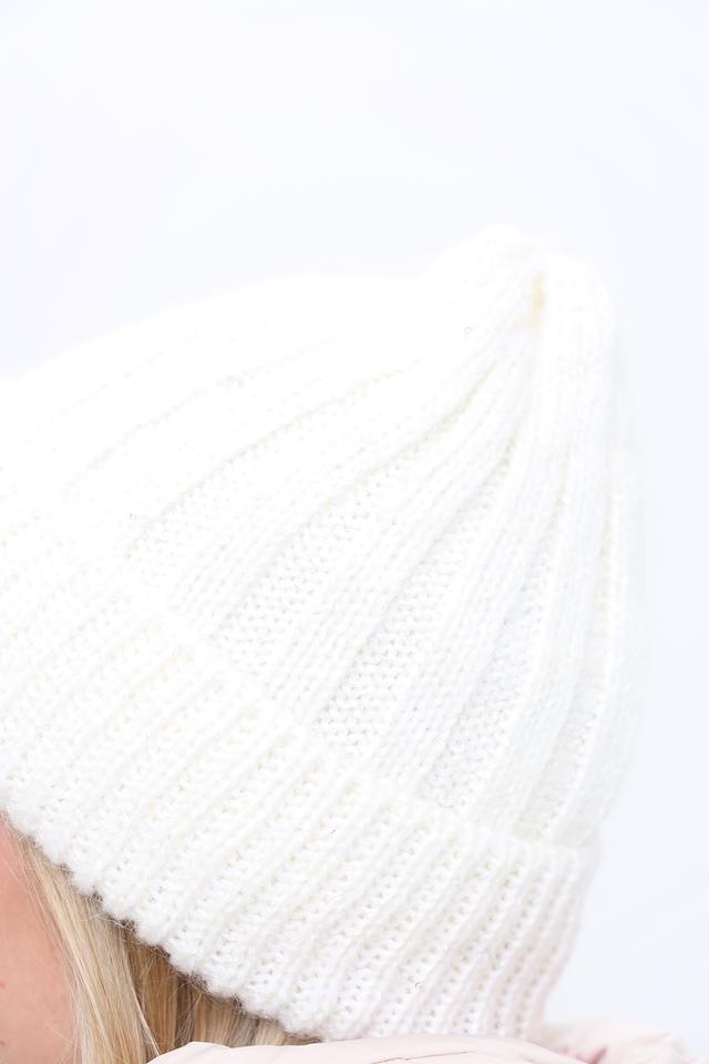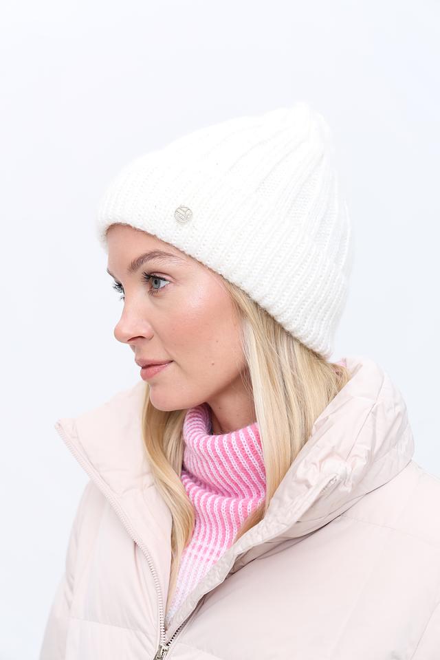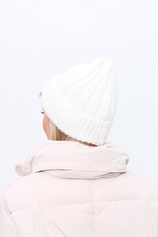 Шапка имеет классический дизайн и приятную на ощупь текстуру. Белый цвет делает её универсальной и легко сочетаемой с любой одеждой. Небольшой металлический элемент добавляет шапке изысканности и стиля.