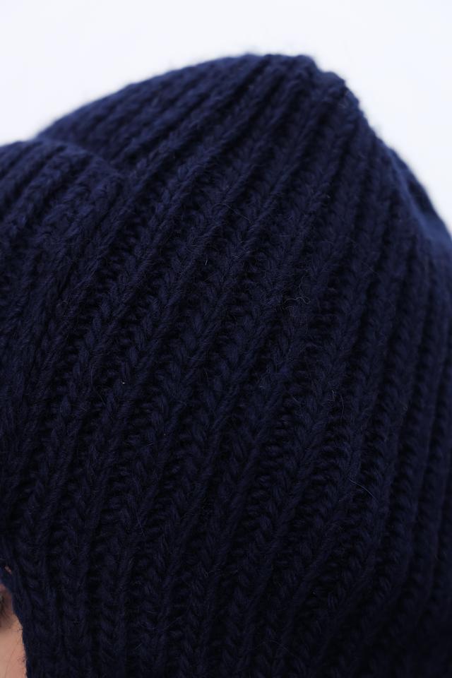 Шапка имеет плотную вязку, которая не только хорошо сохраняет тепло, но и придает ей стильный внешний вид. Классический тёмно-синий цвет легко сочетается с любой одеждой, делая эту шапку универсальным дополнением к вашему образу.