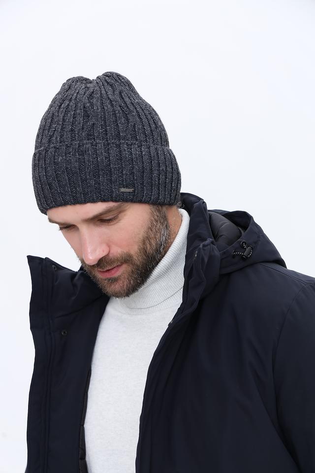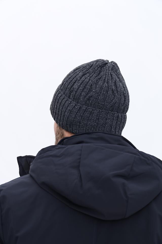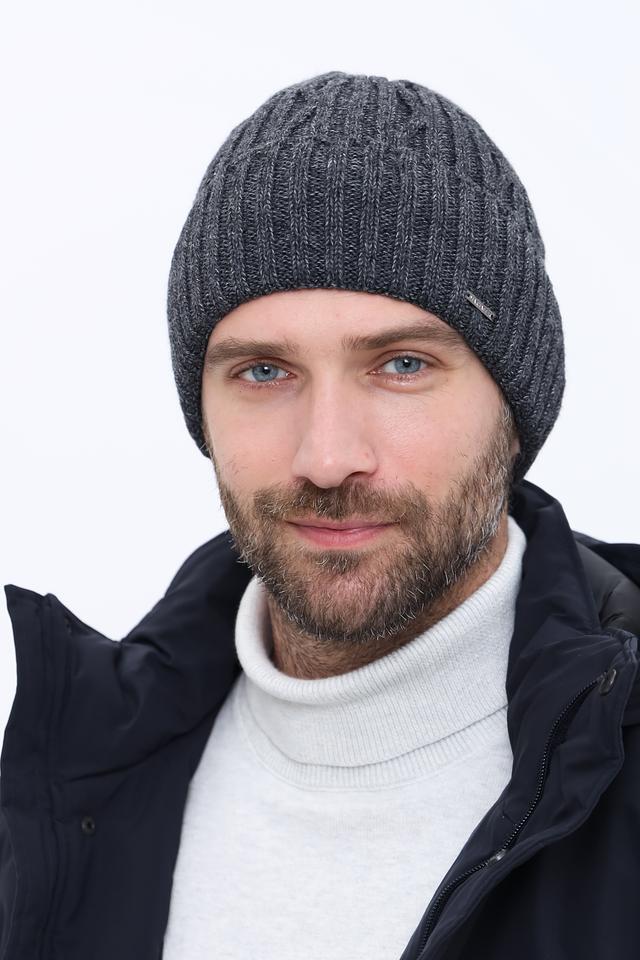 Шапка имеет классический дизайн с плотной вязкой, что придает ей стильный и современный вид. Преобладающий серый цвет делает её универсальной и легко сочетаемой с различной верхней одеждой.