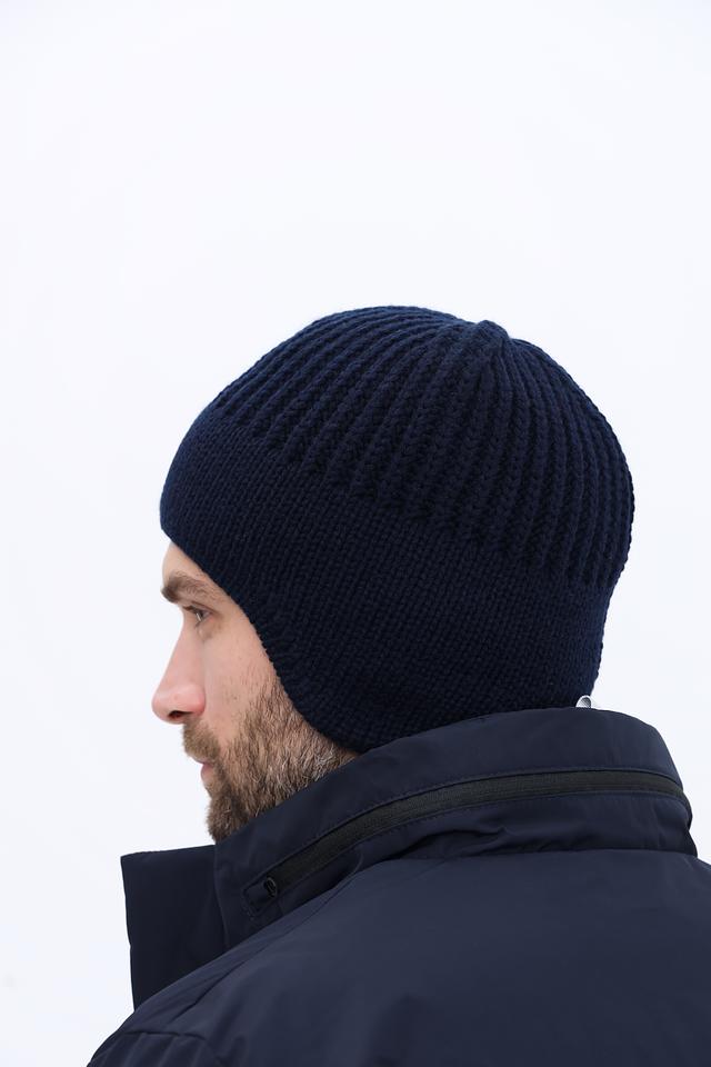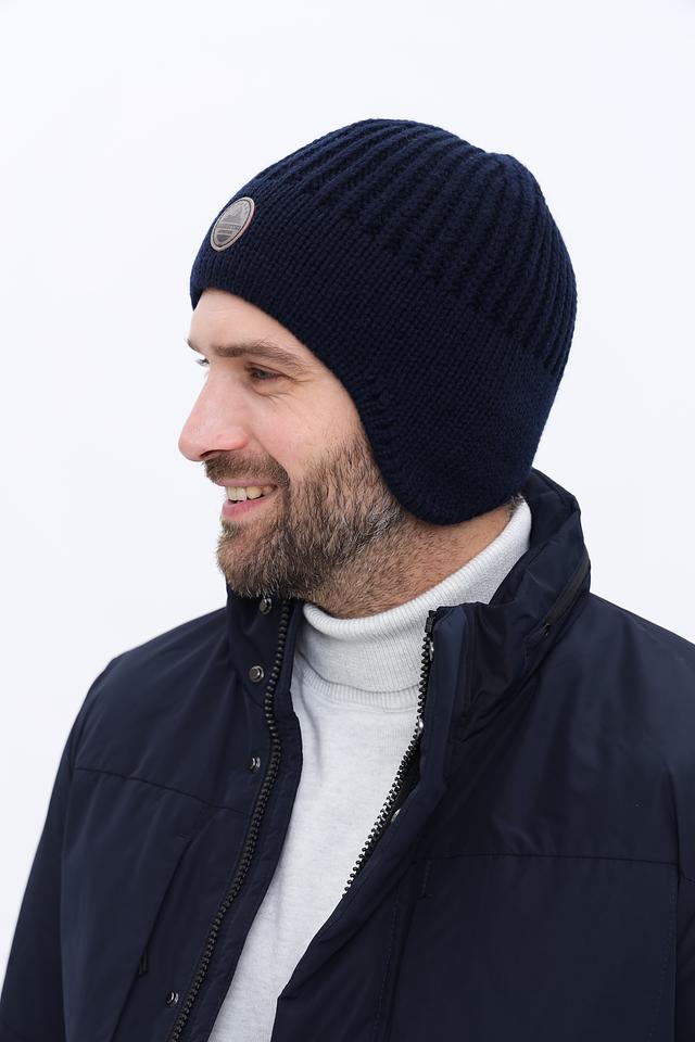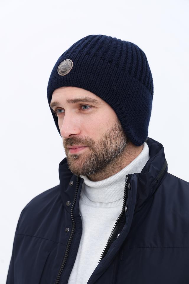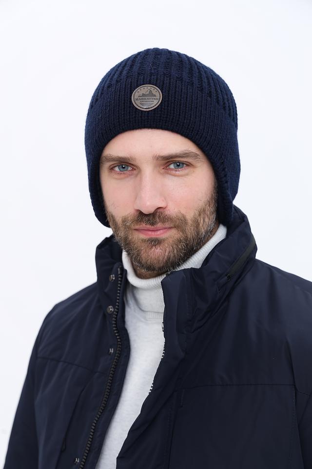 Мужская шапка Marhatter синего цвета выполнена из плотного вязаного полотна с текстурным узором. Аксессуар дополнен кожаным лейблом с логотипом бренда для узнаваемости. Состав: Состав_2 полиэстер 100%, полиакрил 70%, шерсть 30%