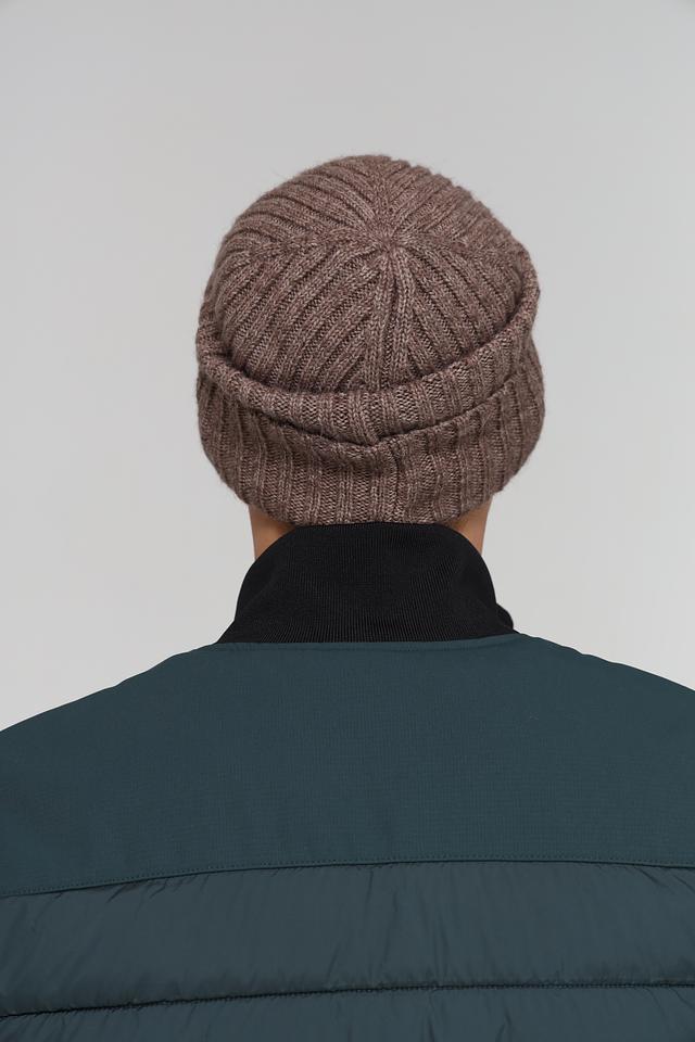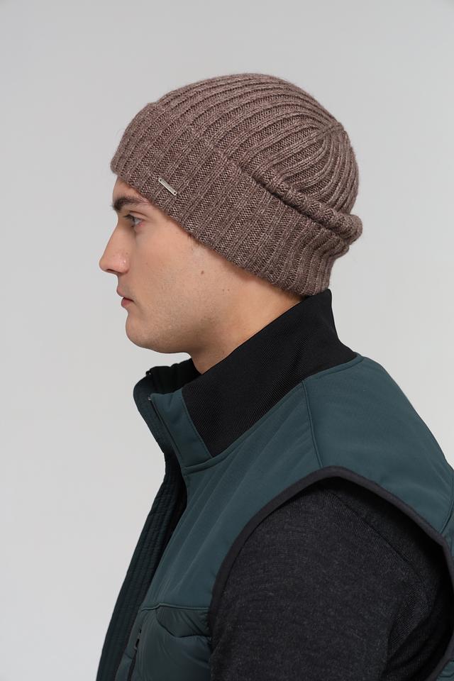 Шапка имеет классический дизайн и бежевый цвет, который легко сочетается с различными стилями одежды. Плотная вязка обеспечивает хорошую посадку и защиту от ветра и холода. Небольшой металлический логотип добавляет шапке изысканности.