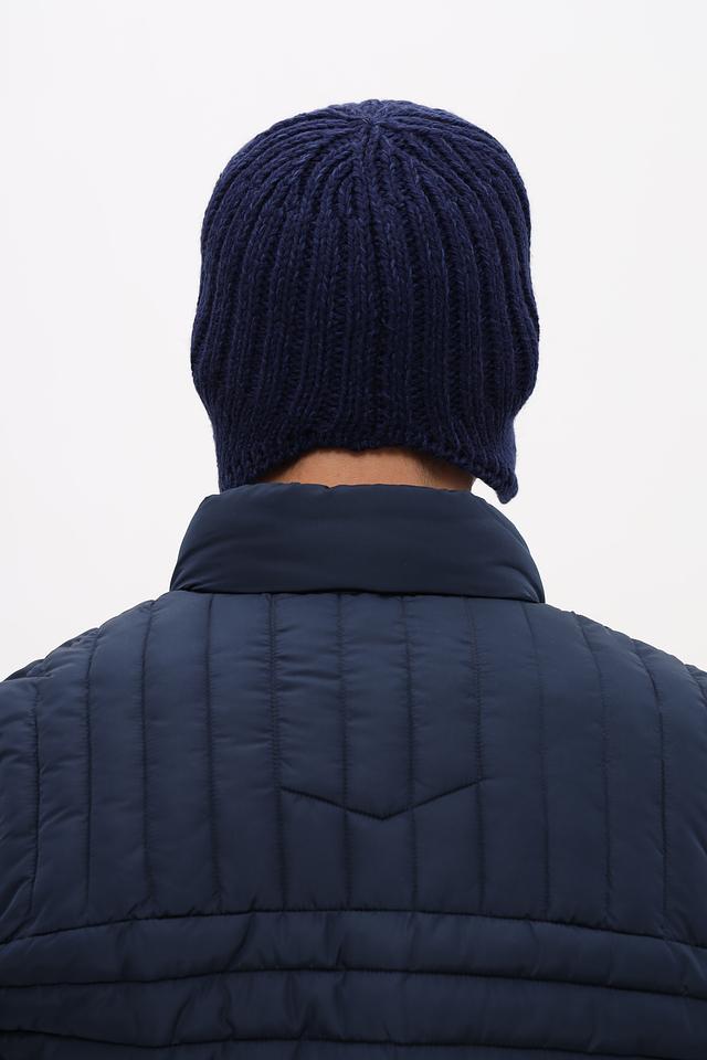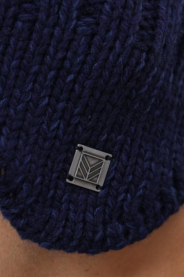 Шапка выполнена в насыщенном синем цвете и имеет классический дизайн с отворотами. Вязаная текстура придает шапке уютный вид. Сбоку шапки расположен небольшой металлический логотип бренда, который добавляет узнаваемости.