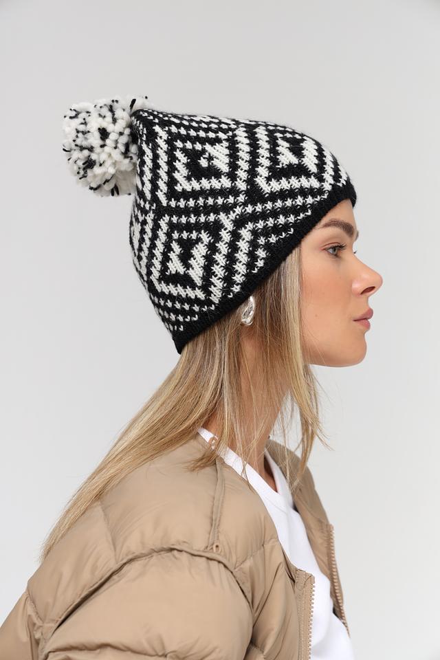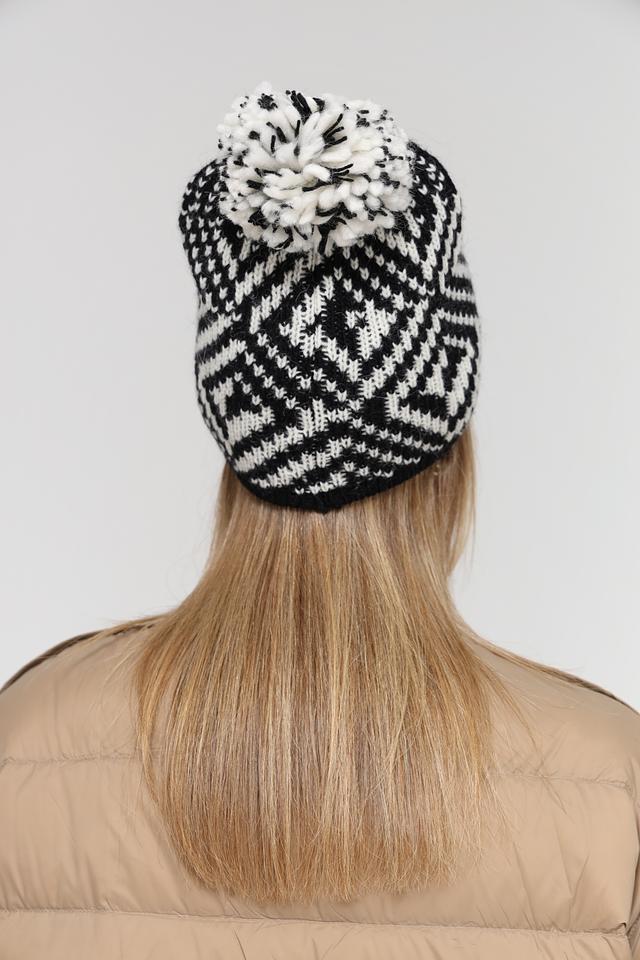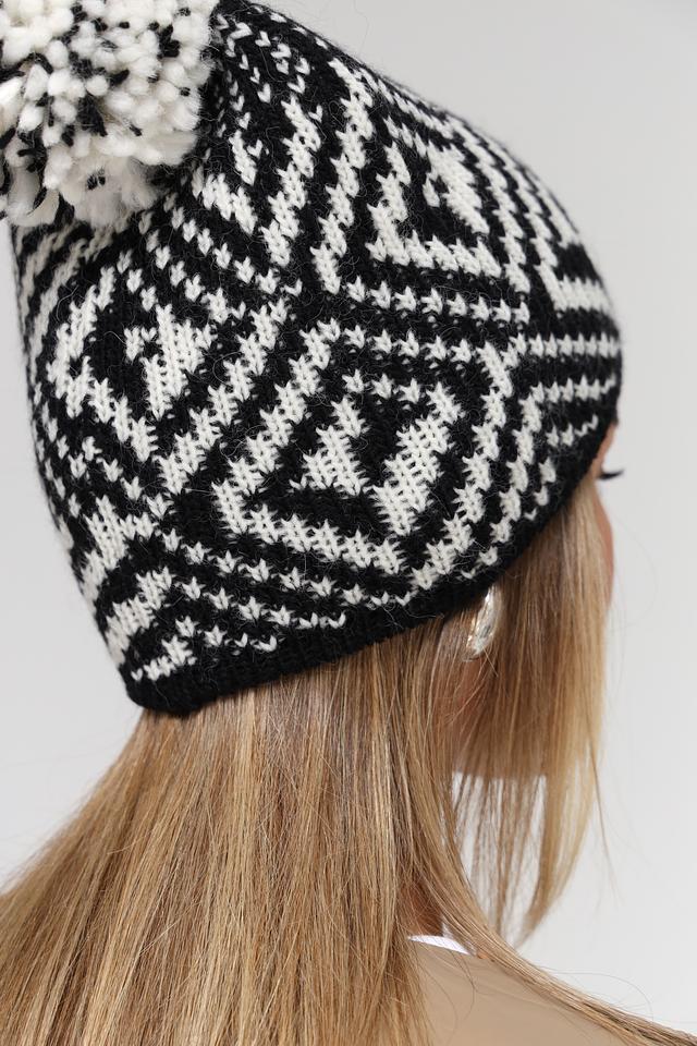 Женская шапка Marhatter чёрно-белого цвета с геометрическим узором и помпоном. Модель выполнена из мягкой пряжи с добавлением шерсти и альпаки для комфорта и тепла. Состав: шерсть 47%, акрил 45%, альпака 8%