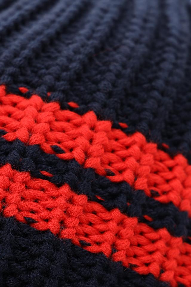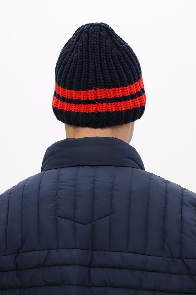 Мужская шапка Marhatter тёмно-синего цвета с яркими красными полосами. Изготовлена из мягкого сочетания полиакрила и шерсти, обеспечивая комфорт и тепло в холодное время года. Шапка дополнена нашивкой с логотипом бренда. Состав: полиакрил 70%, шерсть 30%