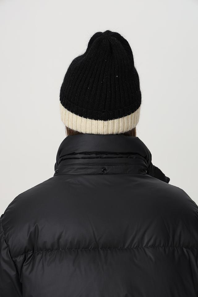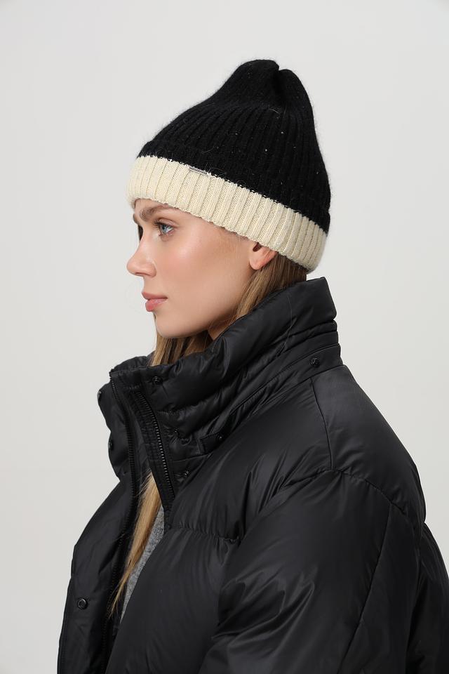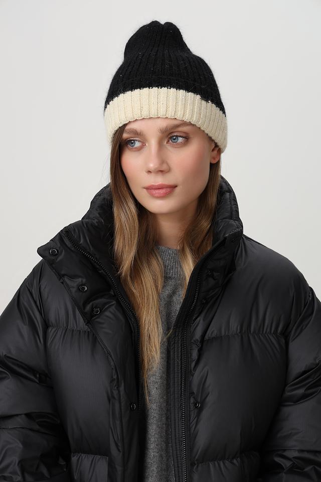 Классическая вязаная шапка от Marhatter, выполненная в сочетании двух цветов и фактур. Верхняя часть шапки выполнена из объёмной пряжи чёрного цвета, создающей эффект лёгкой небрежности. Нижняя часть – широкий вязаный отворот кремового оттенка, добавляющий образу мягкости и уюта.