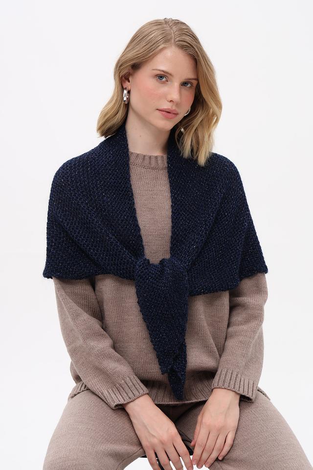 Тёмно-синяя косынка Marhatter выполнена из мягкого сочетания полиакрила и мохера с добавлением металлизированной нити. Аксессуар имеет треугольную форму и фактурную вязку, что придает ему особый шарм и тепло. Состав: полиакрил 69%, мохер 28%, метализ.нить 3%