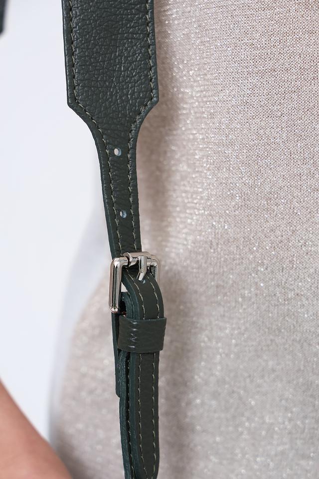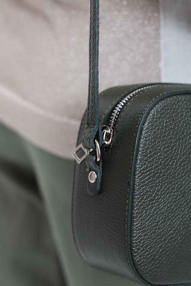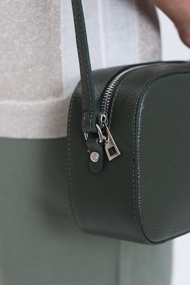 Сумка имеет тёмно-зелёный цвет, который легко сочетается с различными стилями одежды. Её компактный размер позволяет удобно разместить все необходимые вещи, такие как телефон, кошелек и ключи.