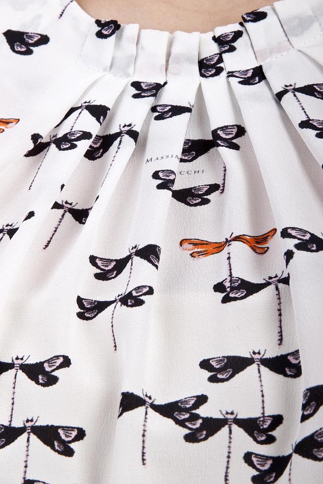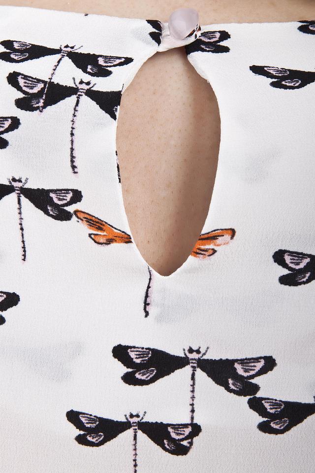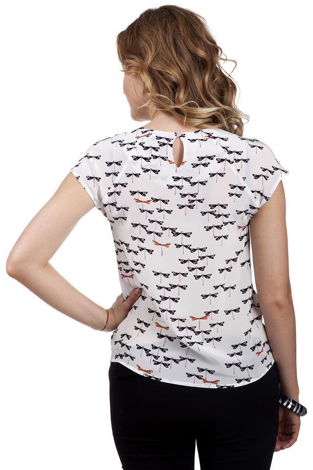 Блуза имеет свободный крой и короткие рукава, что обеспечивает свободу движений. Особенностью модели является оригинальный принт с изображением бабочек в черном, оранжевом и коричневом цветах на белом фоне.