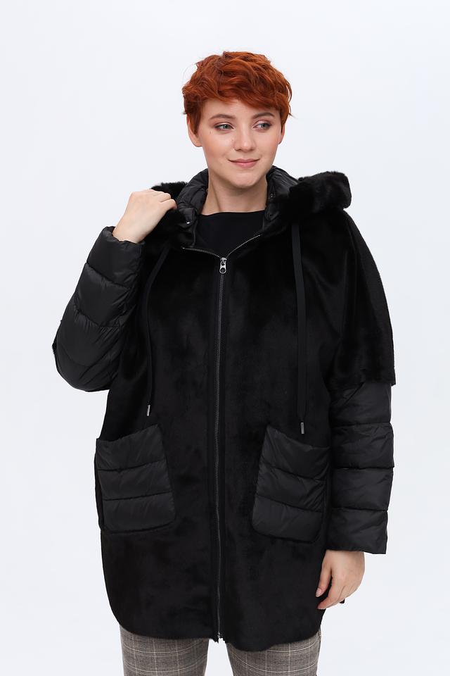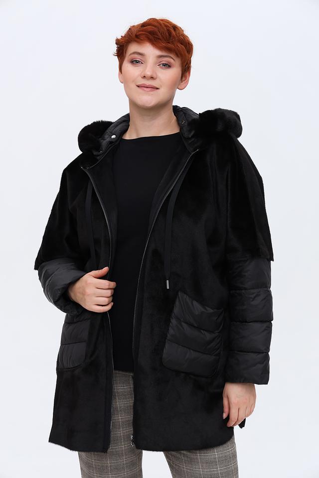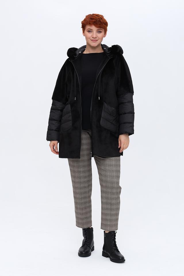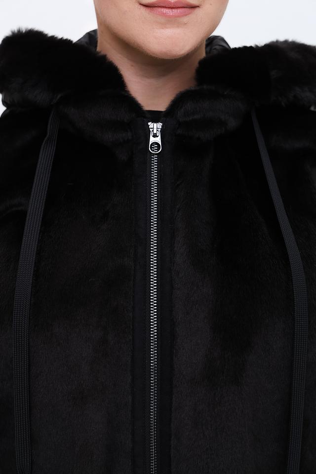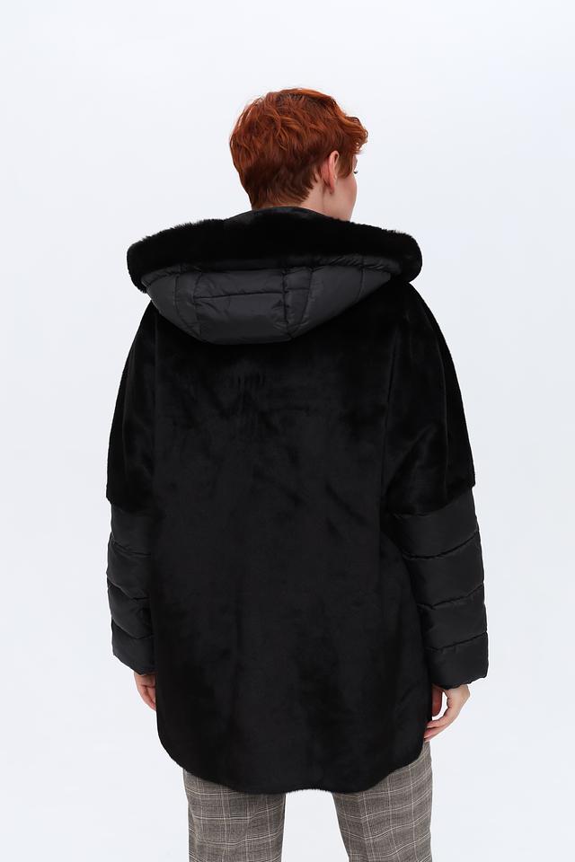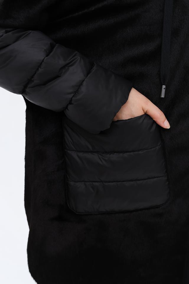 Дизайн пальто сочетает в себе фактурный искусственный мех и стеганые вставки, создавая интересный контраст. Капюшон отделан мягким искусственным мехом, защищая от ветра и холода. Застежка-молния позволяет легко регулировать степень утепления.
