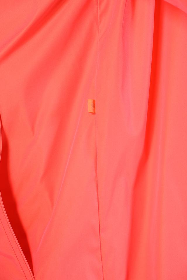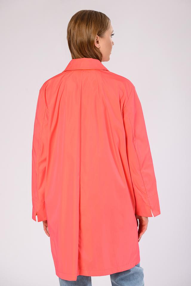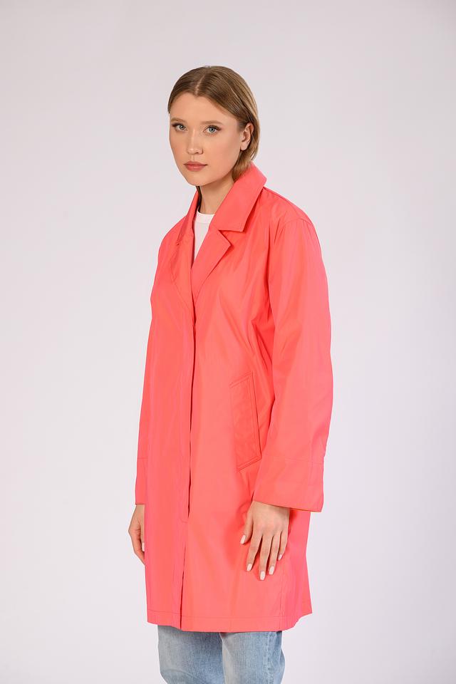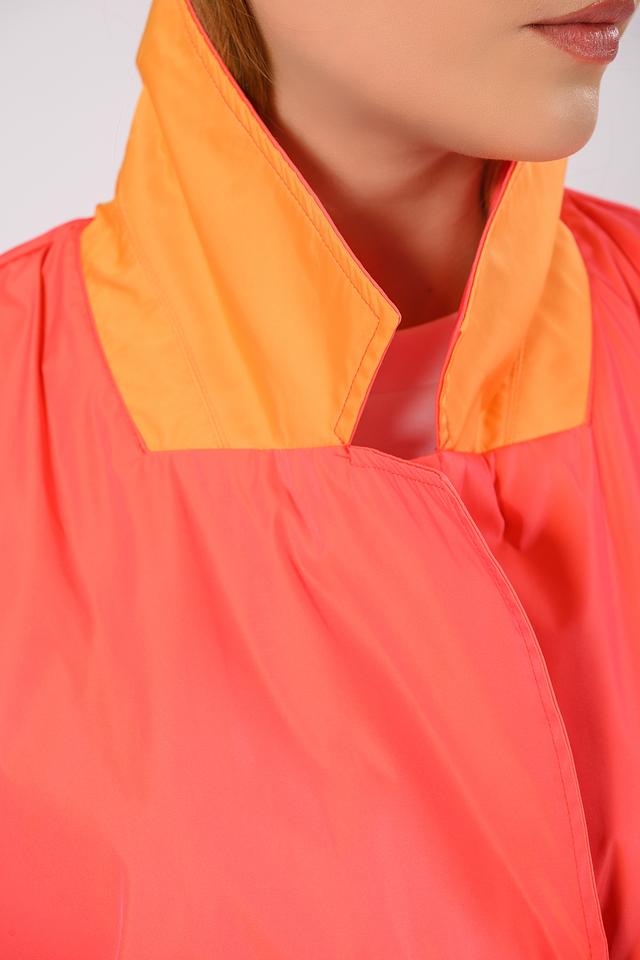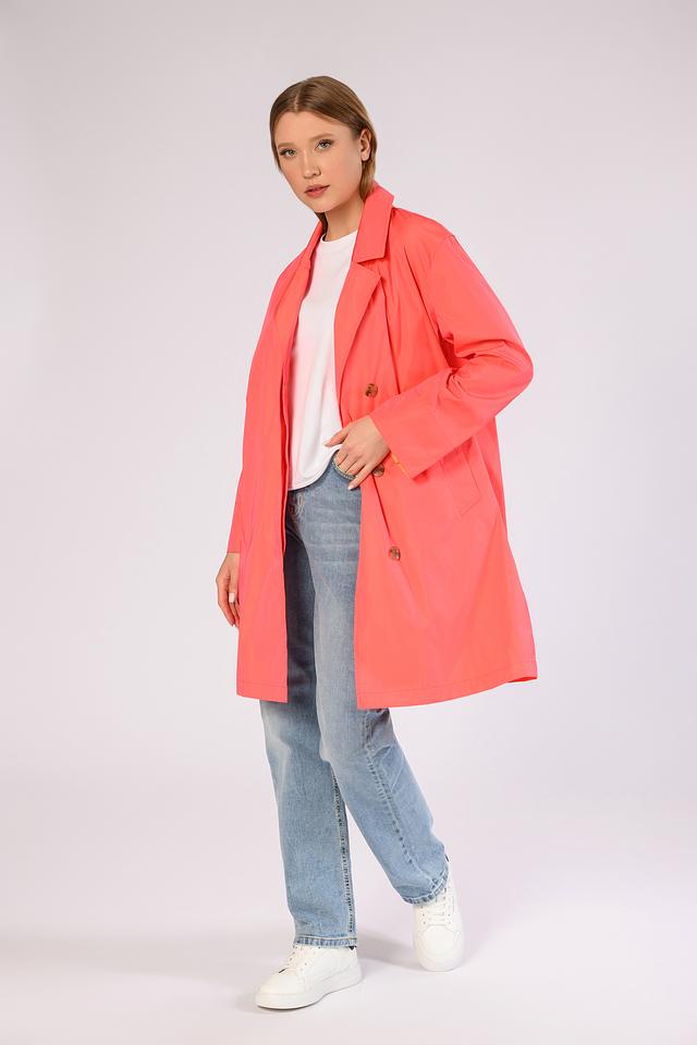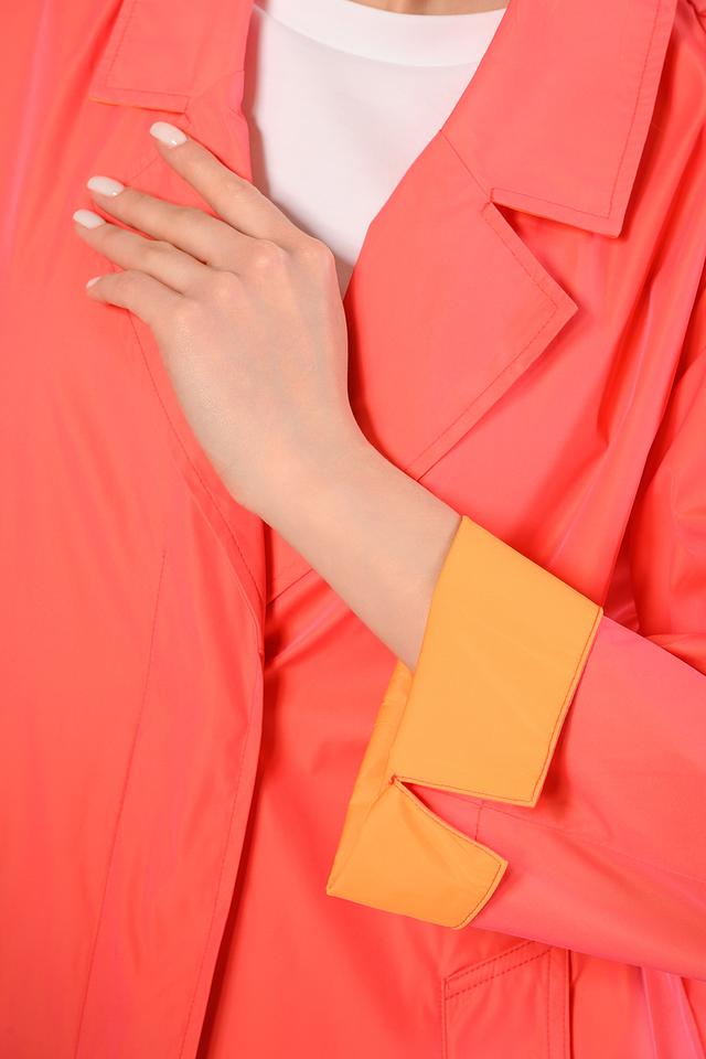 Особый акцент плаща — яркий коралловый цвет и контрастная оранжевая подкладка, что добавляет образу оригинальности и стиля. Этот плащ станет незаменимым элементом вашего демисезонного гардероба.