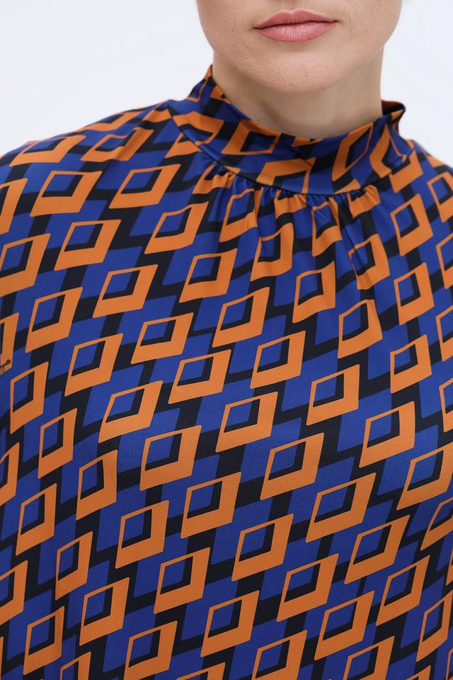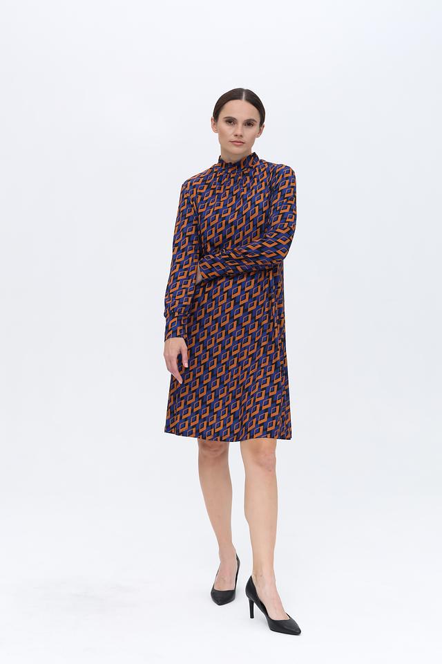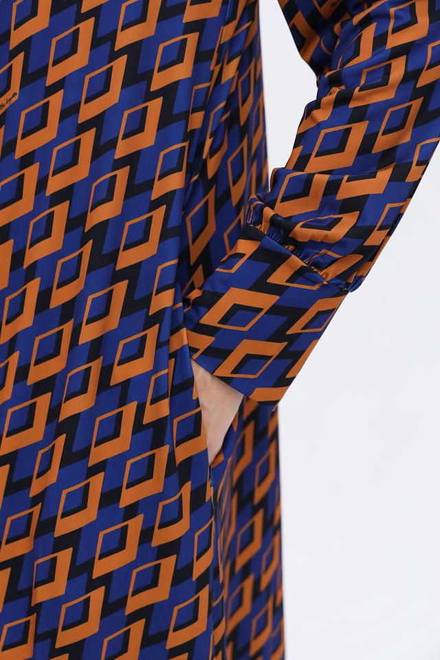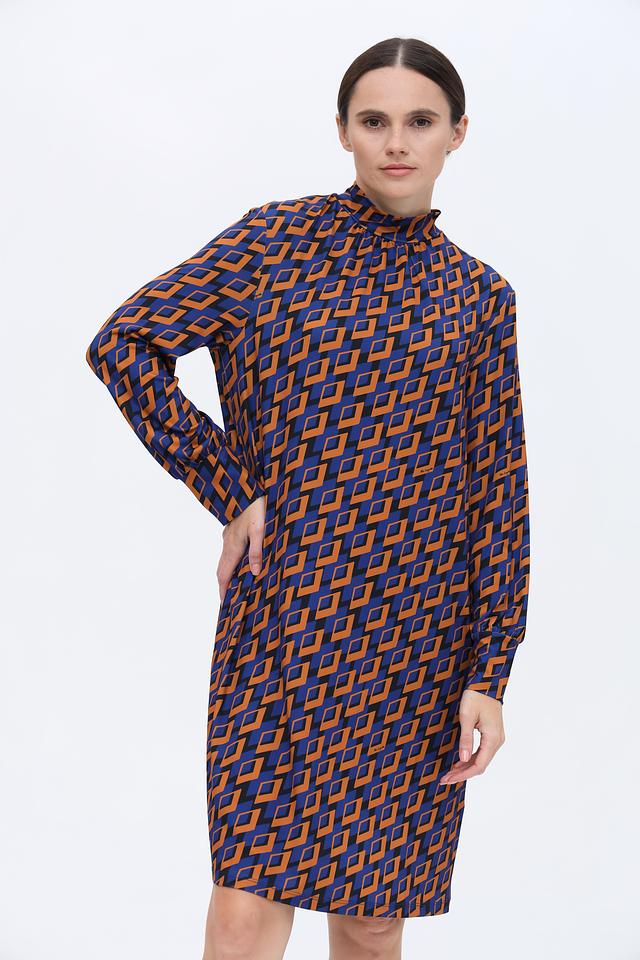 Особенностью этого платья является яркий геометрический принт, сочетающий в себе оттенки синего и оранжевого. Такой рисунок делает платье запоминающимся и привлекает внимание. Платье идеально подойдет для создания как повседневных, так и вечерних образов.