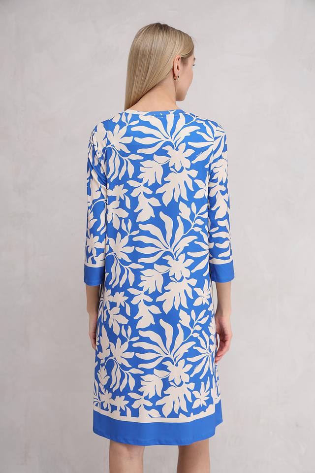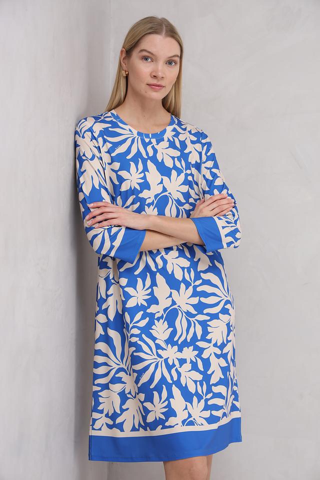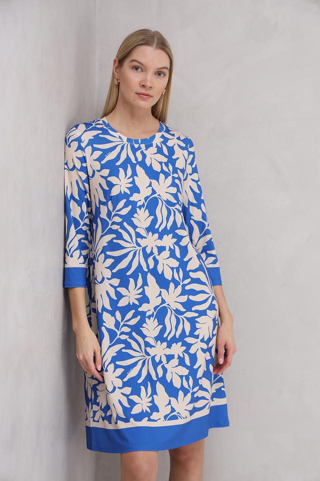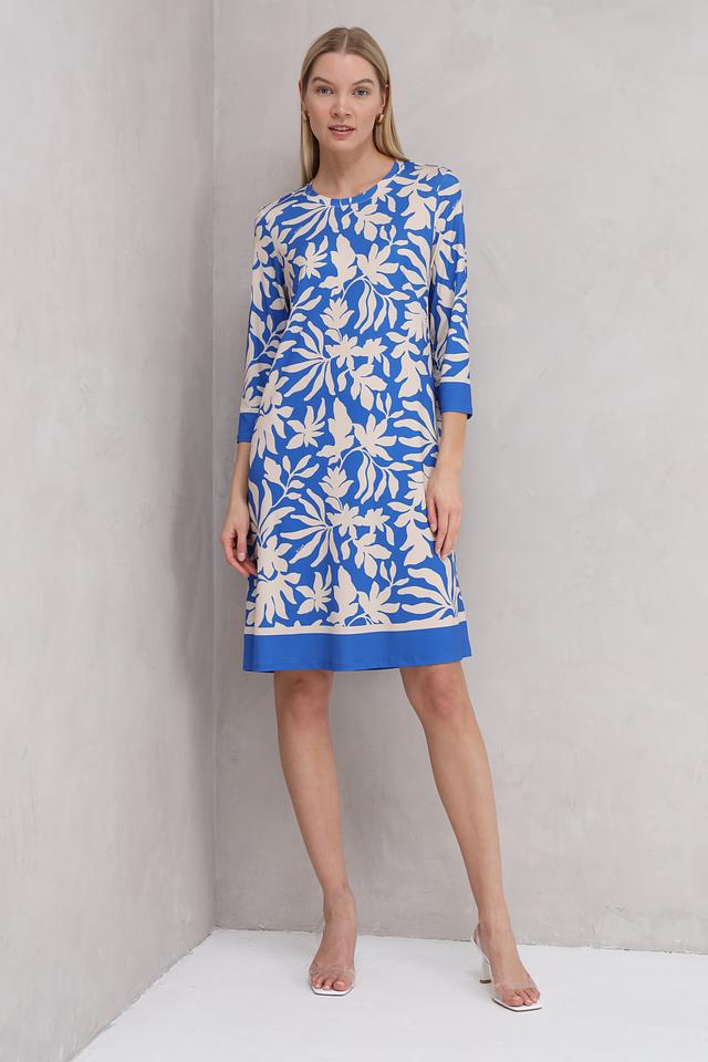Дизайн платья отличается лаконичностью и элегантностью. Круглый вырез горловины и рукава длиной 3/4 придают модели женственность. Платье имеет прямой силуэт, который подходит для разных типов фигур. Отделка низа платья выполнена в виде широкой полосы контрастного синего цвета.